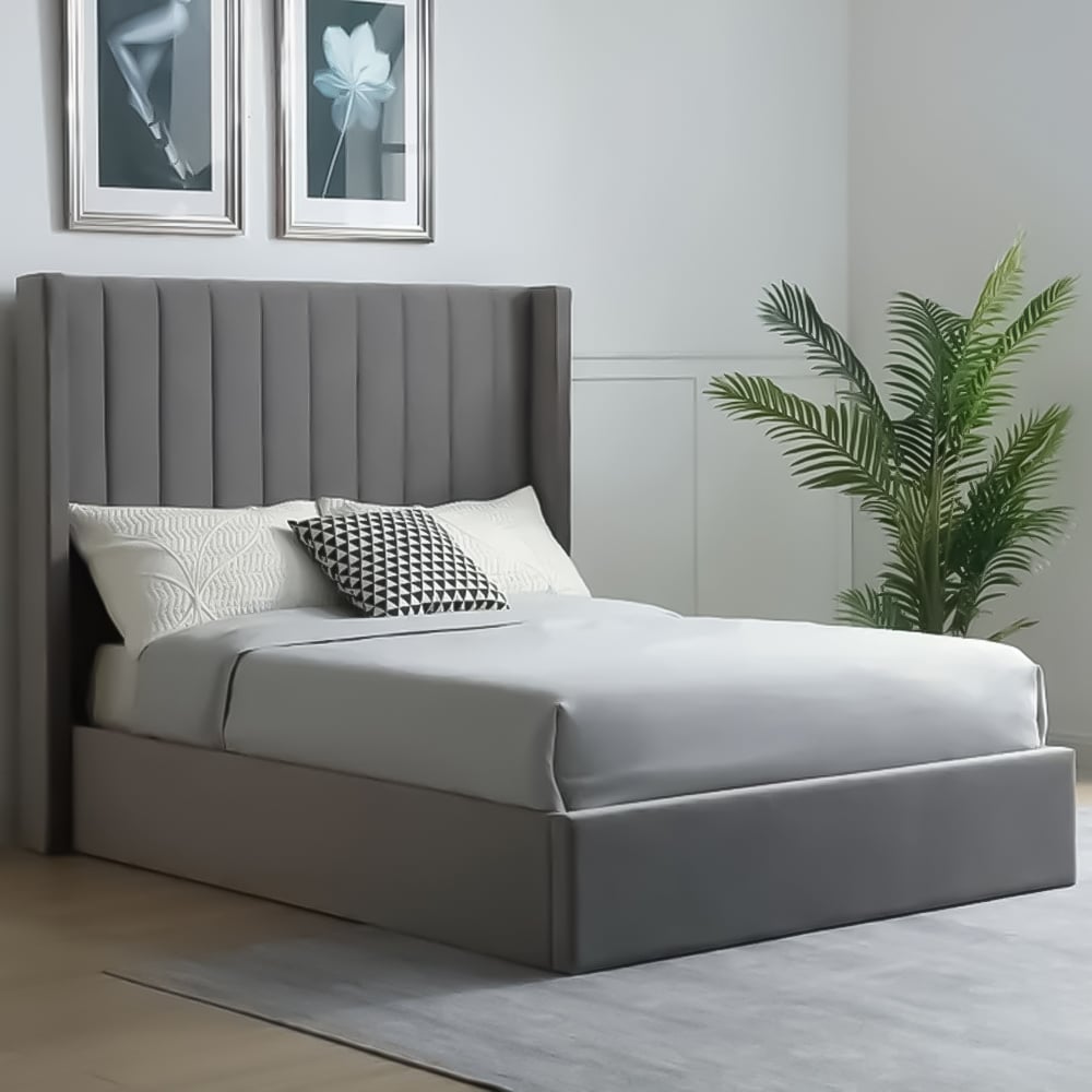 Redefine your sleep sanctuary with the Atticus Super King Grey Velvet Ottoman Bed. This chic ottoman bed frame is designed with spacious under-bed storage and is wrapped in a soft velvet fabric. The elegant winged headboard showcases vertical stitch detailing, making it a sophisticated focal point for any bedroom. This versatile multilift ottoman bed can be lifted from the side or end, and its slatted base ensures optimal comfort and stability for a restful night's sleep.