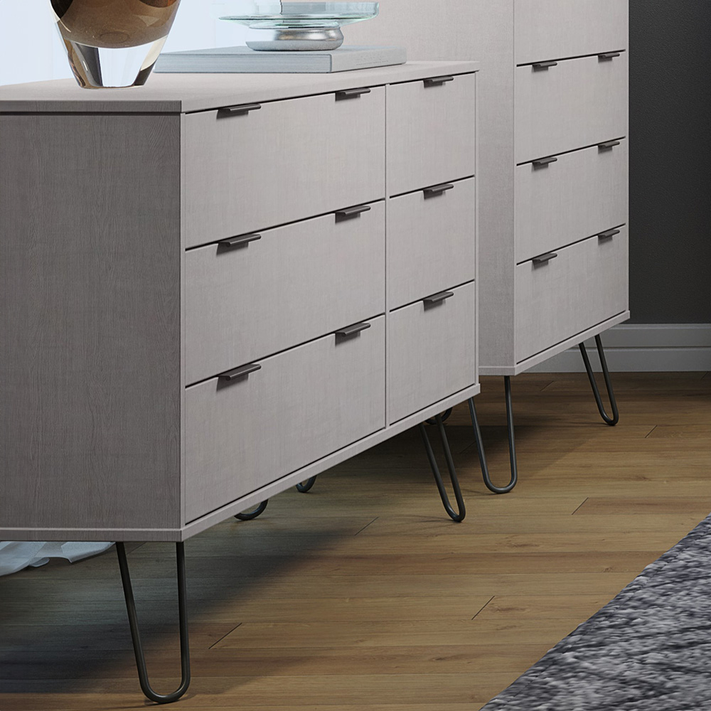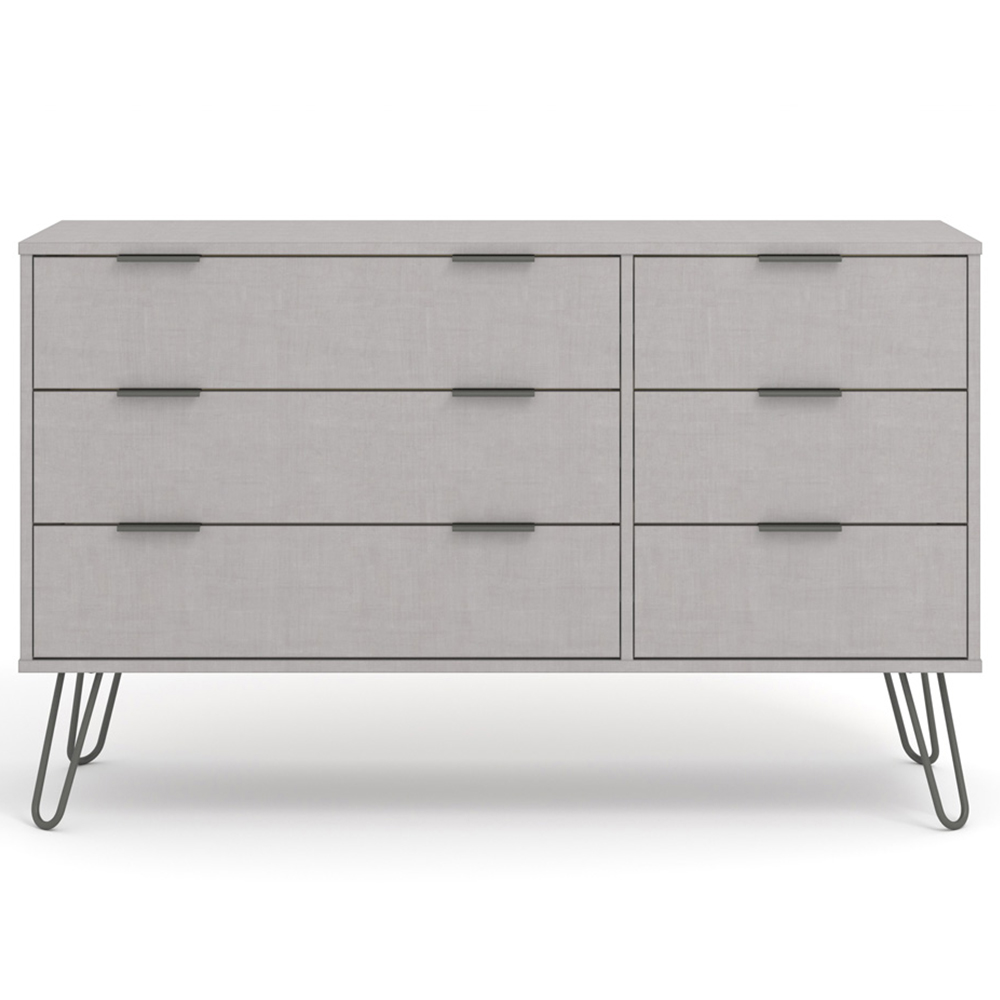 The Augusta Grey Wide Chest is a stylish and practical piece of furniture with an industrial design. It features three wide drawers and three narrow drawers, all set alongside each other. The chest is made from a durable and easy-to-clean grey textured melamine finish. It also has pull handles and grey metal hairpin legs, adding to its modern aesthetic. This chest provides ample storage space for your clothes, with the wide drawers suitable for jumpers, t-shirts, and gym wear, and the narrow drawers perfect for socks, underwear, and nightwear. Additionally, you have the option to add a mirror on top or display your favourite photos. The textured woodgrain finish ensures that this chest is hard-wearing and long-lasting.