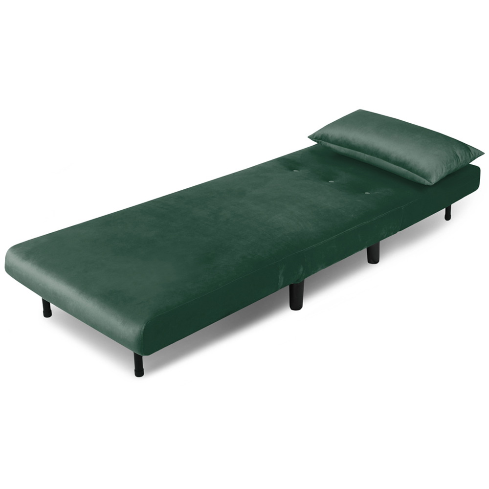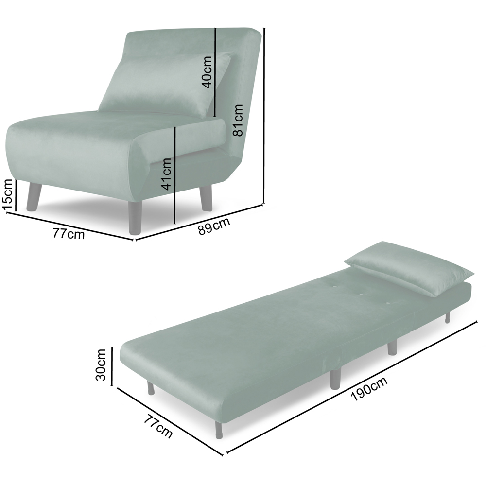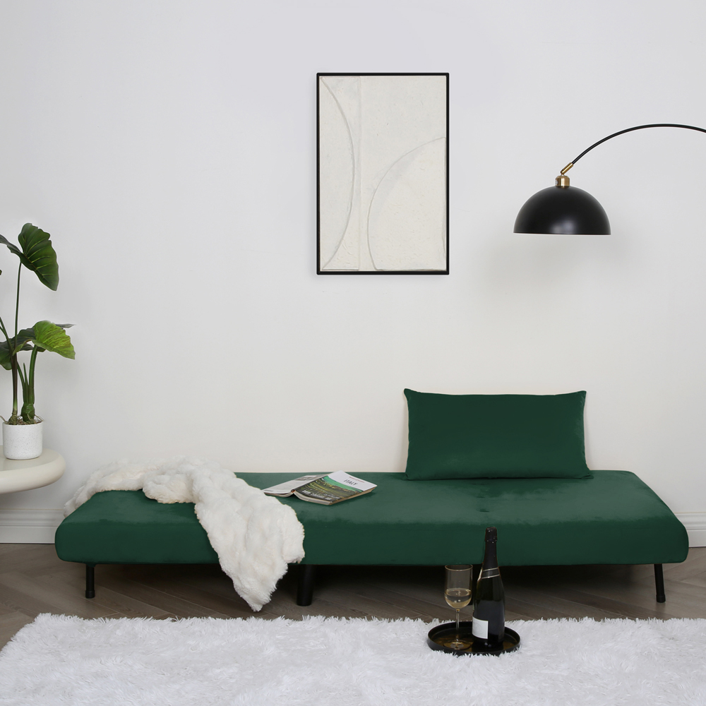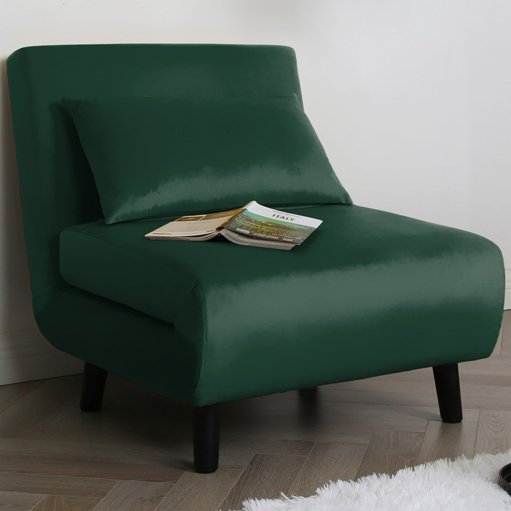 Make the most of your space with the Aurora Single Seater Green Velvet Sofa Bed. The single sleeper sofa bed in plush velvet is a true space-saving hero, ideal for maximising comfort in smaller living spaces. Designed for effortless use, it quickly transforms from a cosy single chair into a comfortable bed in just seconds. Its soft velvet upholstery adds a touch of elegance, while the cushion is filled with soft sponge that provides lasting support and relaxation, whether you are sitting or sleeping. No complicated setup is needed as it arrives fully assembled, so you simply attach the legs, and it’s ready to go.