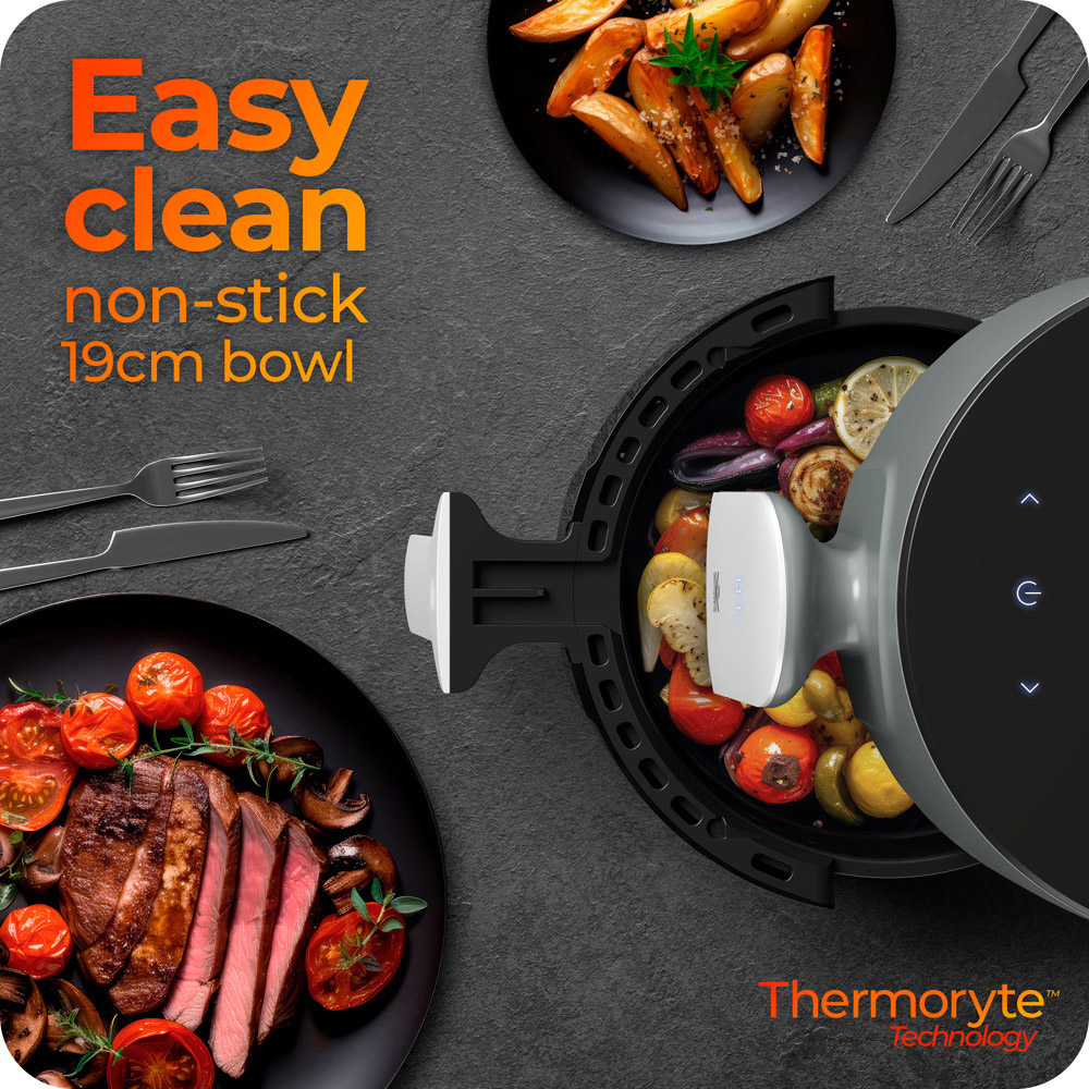 Cook delicious and healthy food for loved ones with this Avalla A-175 Grey 4L Digital Air Fryer. It's powered by fusion-flow technology which circulates hot air around your food to enhance its flavour while saving up to 54% energy costs compared to traditional ovens. It comes with a 4L capacity non-stick pot that allows you to cook delightful, home-cooked meals without wasting a lot of time cooking and cleaning. With eight pre-set options for different foods, you can cook perfectly mouthwatering food every time. While the powerful 1200W motor speeds up the cooking process by 36%, so you can spend less time in the kitchen and more time doing what you love.