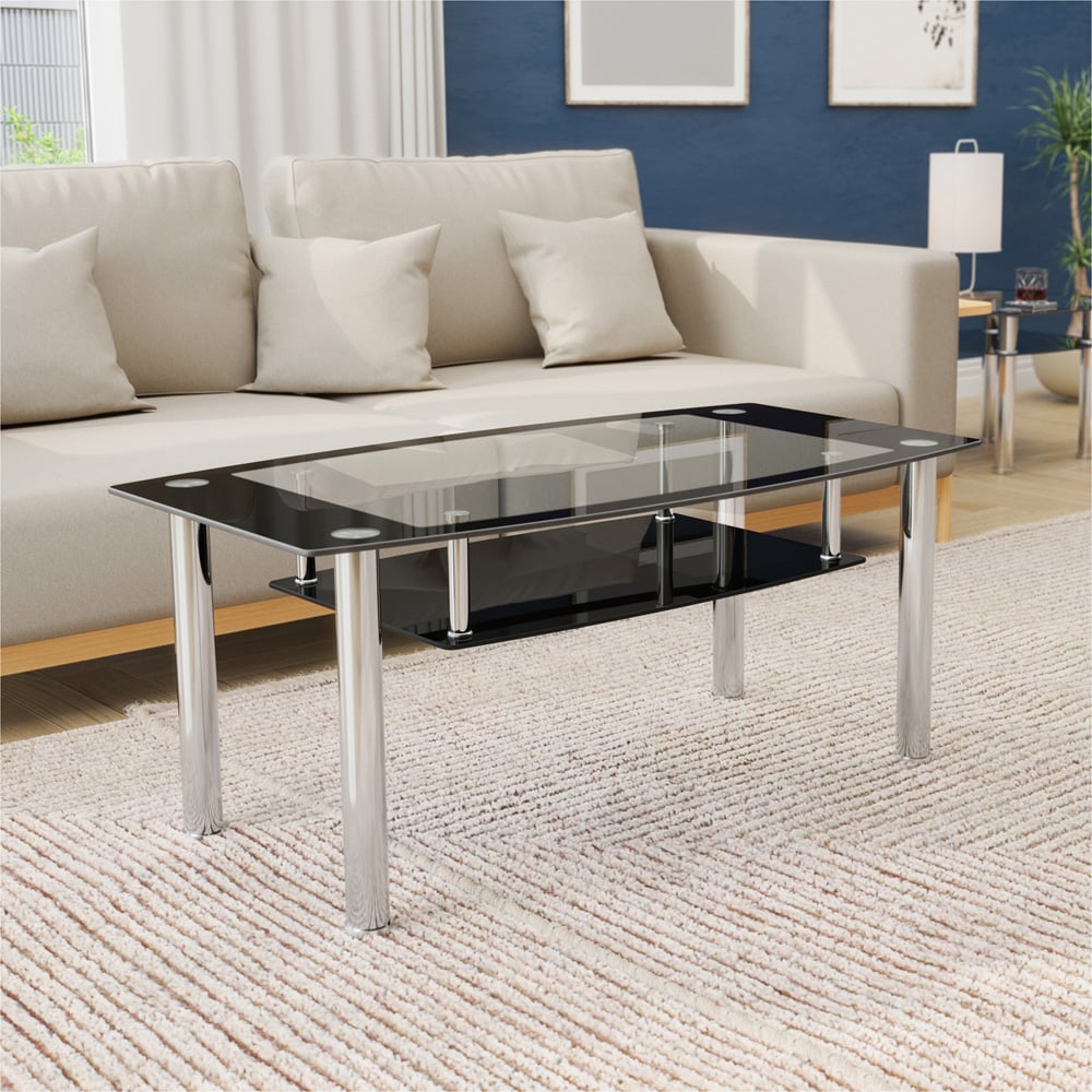 Make a stylish and practical addition to your home with the AVF Black Glass and Chrome Coffee Table. With a black tempered glass top and chrome legs, the minimalist style table easily blends in with your decor. Featuring an additional shelf for extra space, this must-have versatile solution for your home needs has a sturdy design and is easy to assemble. The shelves are strong and sturdy enough to hold all your accessories, with a top shelf capacity of 20kg and a lower shelf capacity of 5kg. Crafted with precision and care, the unit embodies the perfect blend of functionality and aesthetic appeal. Elevate your home decor game and make a statement with this stylish unit.