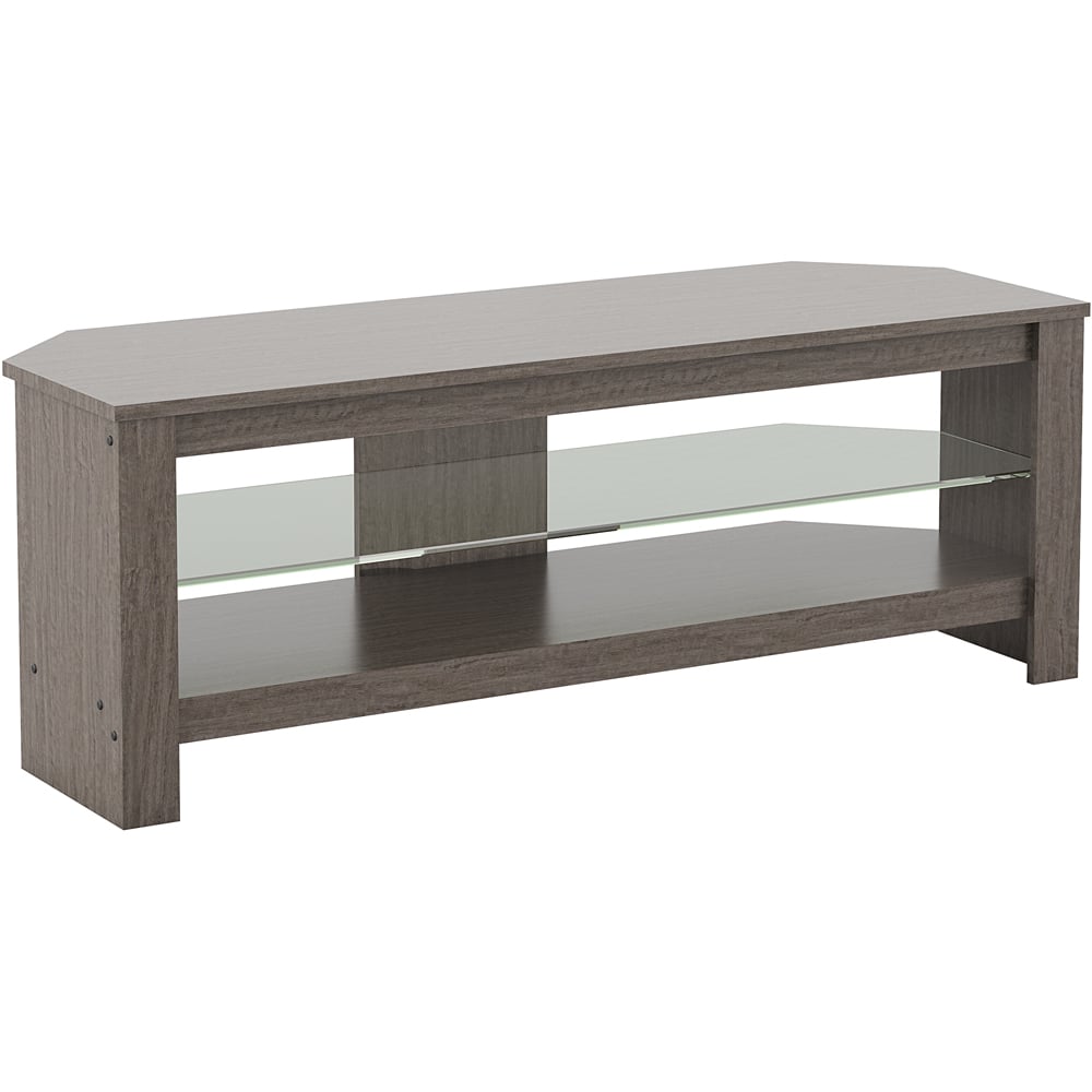 The Calibre is the perfect TV stand for TVs up to 55 inches and 40kg, its minimalist design makes it a great piece of furniture for any room setting. Designed to fit equally well flat against a wall or in the corner of the room, providing ample space for your TV and home entertainment equipment. Sturdy construction, finished in a naturally attractive grey oak wood effect with a toughened glass shelf which provides an elegant way to support your consoles and media players. Quick and easy to install with cable management panel to the rear which allows the use of AV equipment whilst still looking tidy. Please note: Maximum TV sizes are given as a recommendation only and do allow for some screen overhang, the exact dimensions of the TV’s pedestal/feet should be checked to ensure the desired fit prior to purchase.