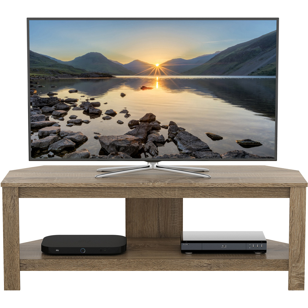 A beautifully constructed TV stand finished in a naturally attractive Rustic Sawn Oak effect, Calibre’s minimalist design makes it a great piece of furniture for any room setting. Designed to fit equally well flat against a wall or in the corner of the room, providing ample space for your TV and home entertainment equipment. Assembly is quick and easy, and all your cables can be kept out of sight behind the rear panel. Please note: Maximum TV sizes are given as a recommendation only and do allow for some screen overhang, the exact dimensions of the TV’s pedestal/feet should be checked to ensure the desired fit prior to purchase.