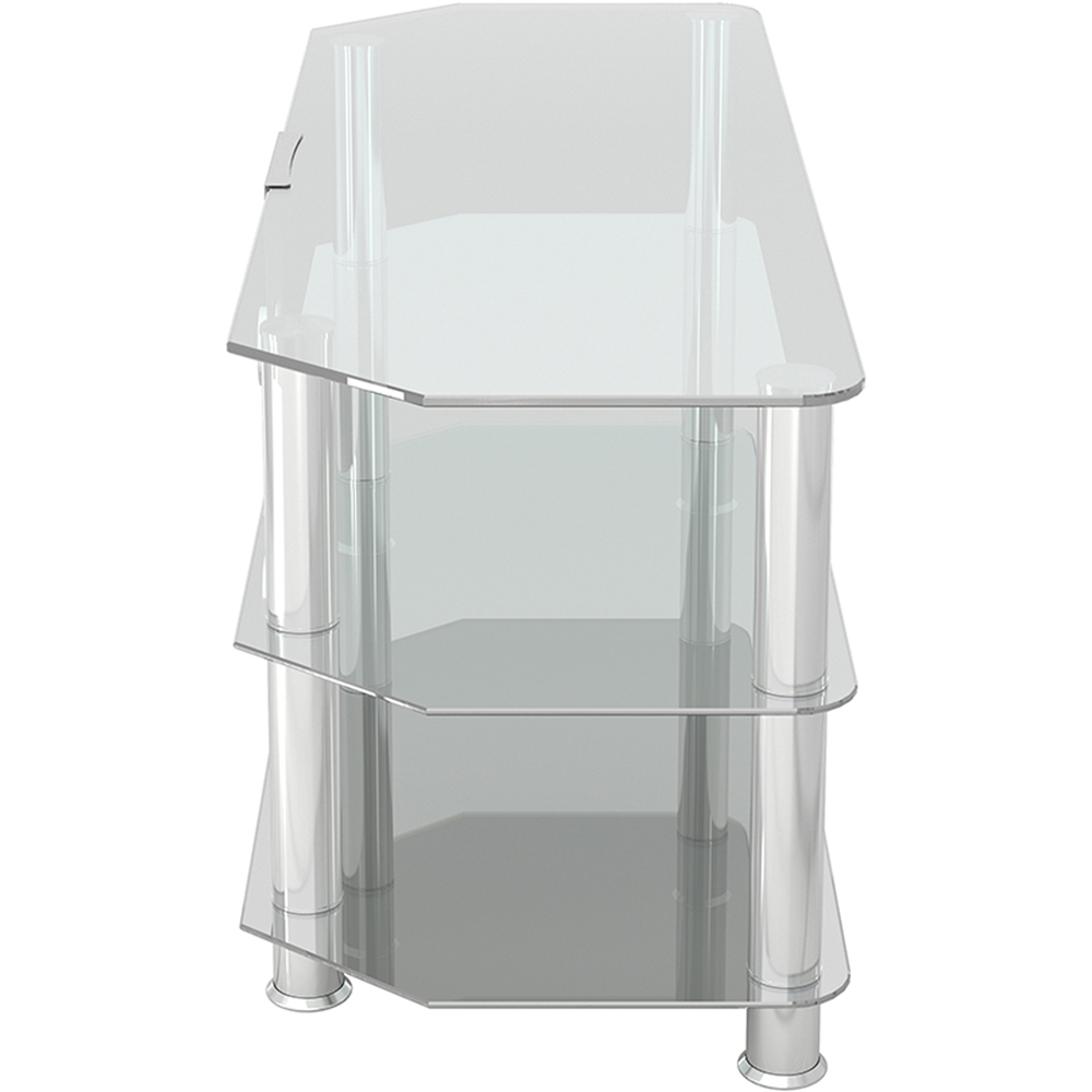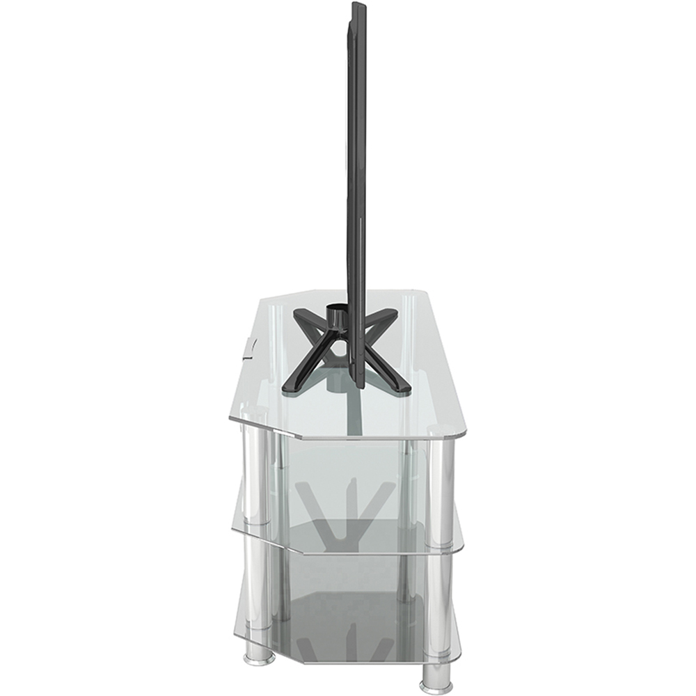 Add a versatile solution for your entertainment needs with the AVF Classic Clear and Chrome 55 Inch 1.14m Glass Corner TV Stand. It is designed for easy assembly with clear tempered safety glass and durable stainless steel legs that modernise any space. Its angled corners save valuable space when placed in a corner of your room, and it supports TVs up to 55 inches and 45kg. The two lower shelves can each hold up to 20kg, perfect for consoles and devices, while the built-in cable management column at the rear keeps your cables neatly organized out of sight. Please note that the maximum TV sizes are recommendations and may allow for some screen overhang, so it's important to check the exact dimensions of your TV’s pedestal or feet to ensure a proper fit before purchase.
