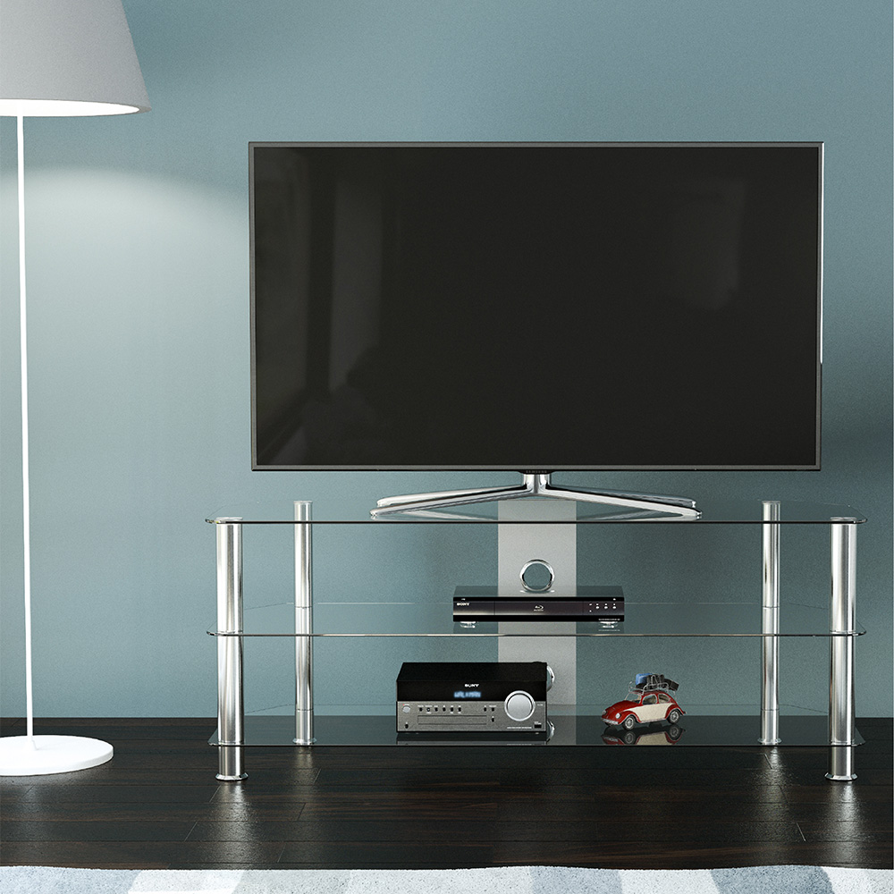 Add a versatile solution to your entertainment requirements with the AVF Classic Clear and Chrome 60 Inch 1.25m Glass Corner TV Stand. It is designed for easy assembly with clear tempered safety glass and durable gloss black legs that modernise any space. Its angled corners save valuable space when placed in a corner of your room, and it supports TVs up to 60 inches and 45kg. The two lower shelves can each hold up to 20kg, perfect for consoles and devices. Please note that the maximum TV sizes are recommendations and may allow for some screen overhang, so it's important to check the exact dimensions of your TV’s pedestal or feet to ensure a proper fit before purchase.