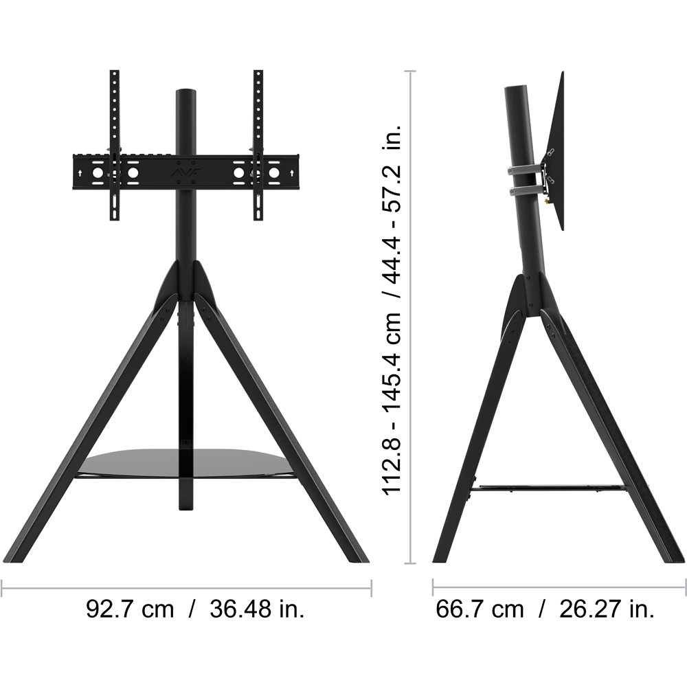 The AVF Hoxton Tripod TV Stand balances a sophisticated minimal look with exceptional strength and stability. Suitable for 32 to 70-inch screens weighing up to 40kg/88lbs, the stand utilises a clever laid-back design to ensure weight is positioned centrally, making Hoxton completely free-standing and allowing it to be positioned virtually anywhere. Featuring three black wood legs with a single black safety glass shelf for media devices. This on-trend piece features AVF TV mounting technology with 15 degrees of easy no tools adjustable tilt, perfect for avoiding light glare and reflections. VESA compatible 100 x 100mm to 600 x 400mm. The steel column section incorporates cable management holes, allowing unsightly wiring to be discreetly guided away from the TV and through clips down the rear leg, while still allowing height adjustment, so screens can be positioned at the desired viewing height.