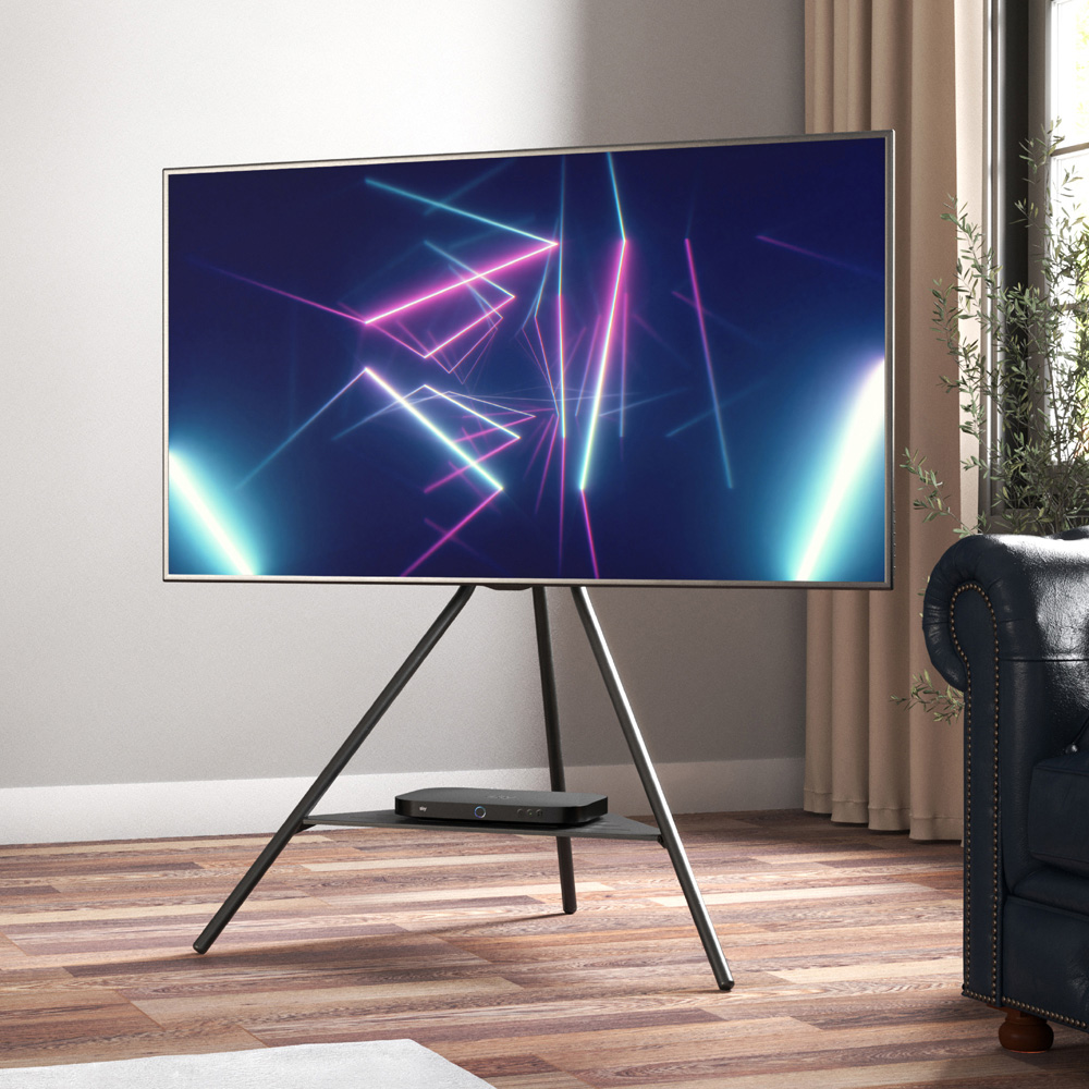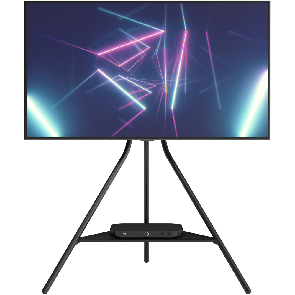 Create an on-trend, minimal look in any room, with this Tiga Tripod TV Stand. Designed to be completely freestanding, Tiga does not need to be anchored to a wall, so you are free to locate it in any position you choose, with its triangular footprint making this TV Stand ideal for use in corners. With three height settings, you can securely mount a screen up to 65” / 40kg at your desired viewing height and then turn up to 22.5° left or right to perfect your viewing angle or reduce on-screen reflections. VESA compatible from 75 x 75mm to 600 x 400mm. Tiga’s lower shelf supports AV devices up to 10kg and is vented to help keep things running cool. A tidy cable aperture in the shelf and hook and loop cable straps on the rear leg reduce cable mess and complete your stylish all-in-one entertainment solution. The foot caps are rounded for smooth, no-damage contact with the flooring. The sleek black powder-coated steel finish contains no solvents or heavy metals, which makes Tiga an eco-conscious purchase and makes it easy to recycle when it finally reaches the end of its life. Packaging is 100% Cardboard with no polystyrene and screw bags are LDPE from a minimum 30% recycled source.