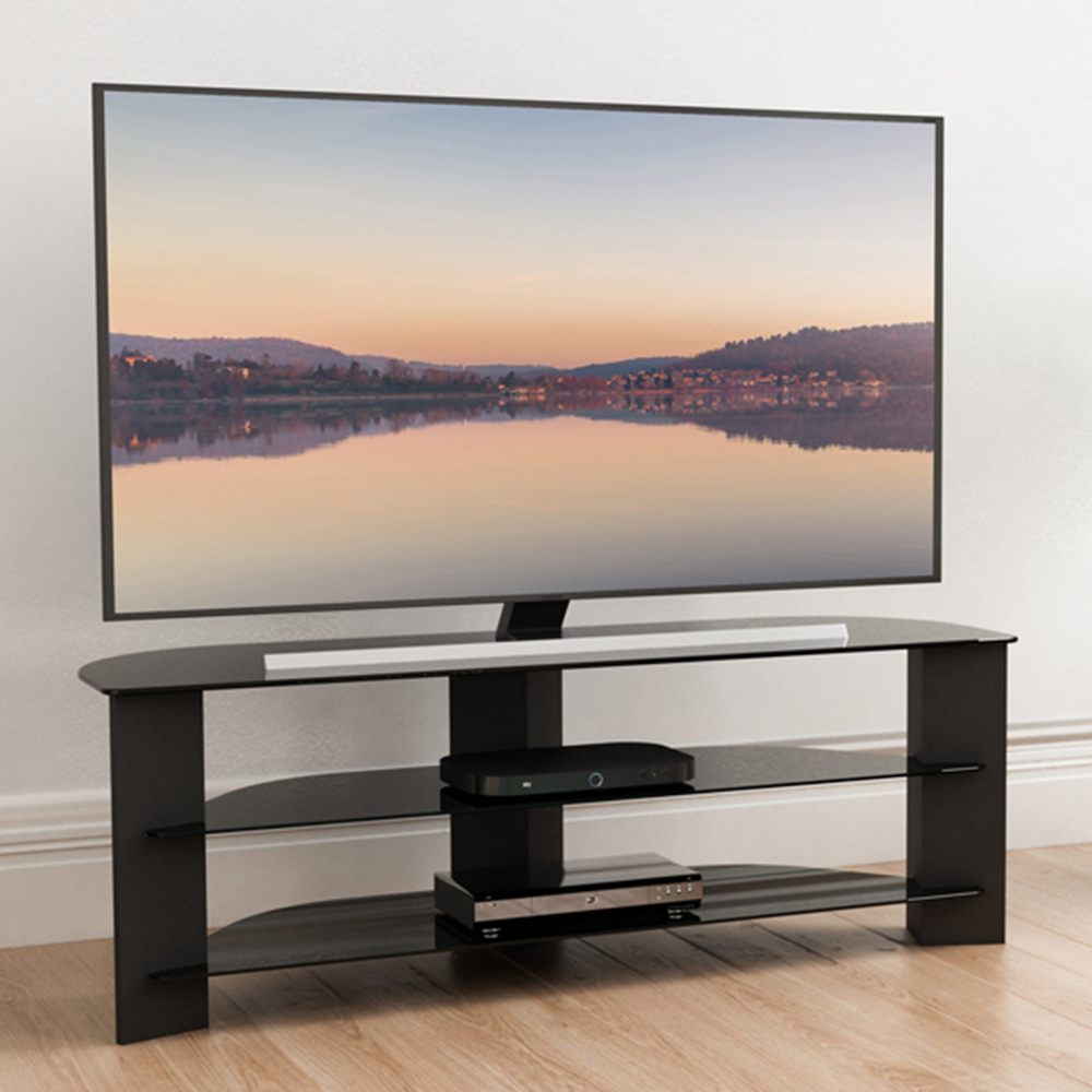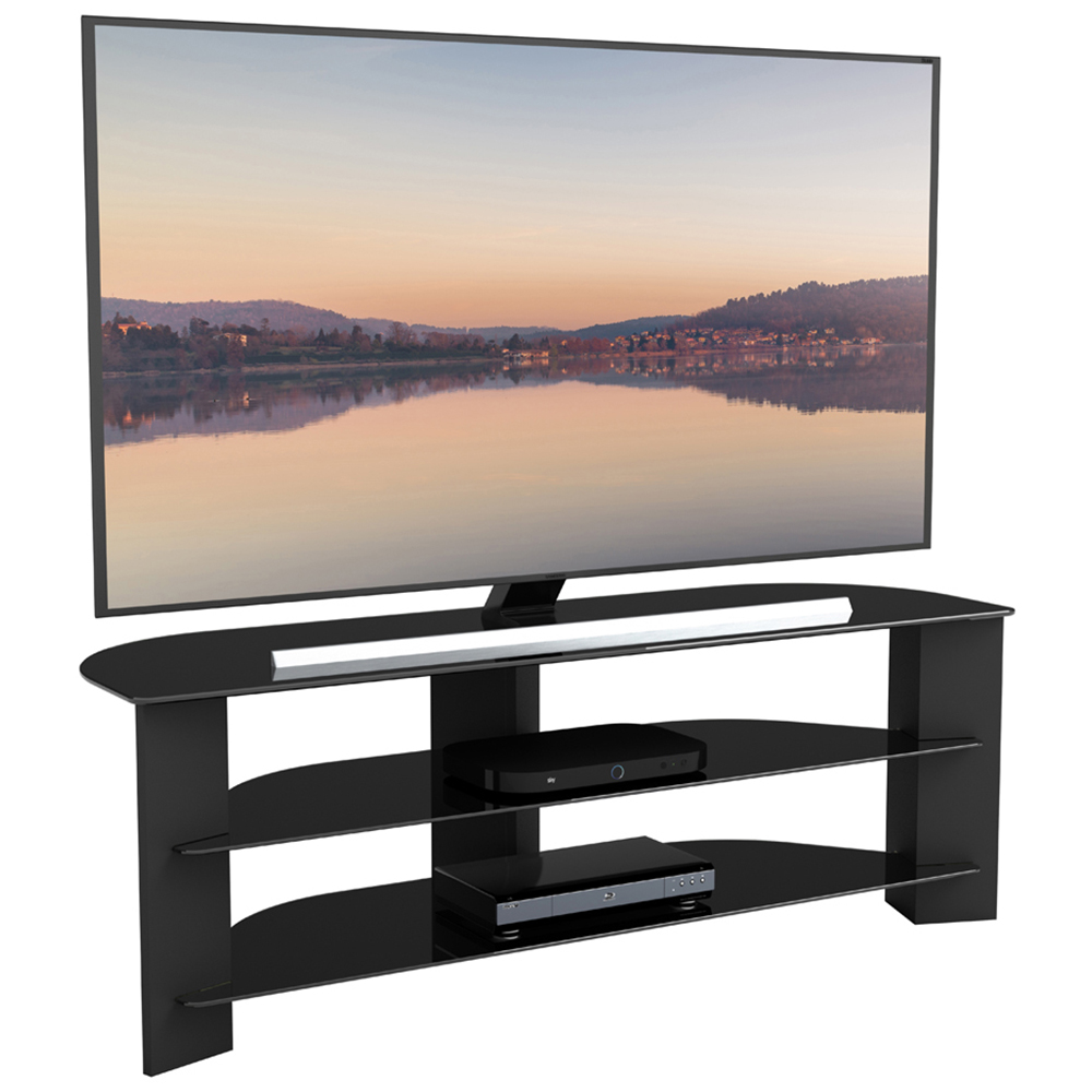Make an elegant choice for your living space with the AVF Varano Black Corner TV Unit 130cm. With its black base and black glass design, it offers a sleek and stylish look. It features three tempered glass shelves, providing ample storage for TVs and AV equipment. The integrated cable management system ensures that wires and equipment stay organised and tidy. The angled legs make it ideal for corner placement or mounting it flat against the wall. It can support TVs up to 65 inches and 50kg in weight. Assembly is quick and easy with simple instructions provided.