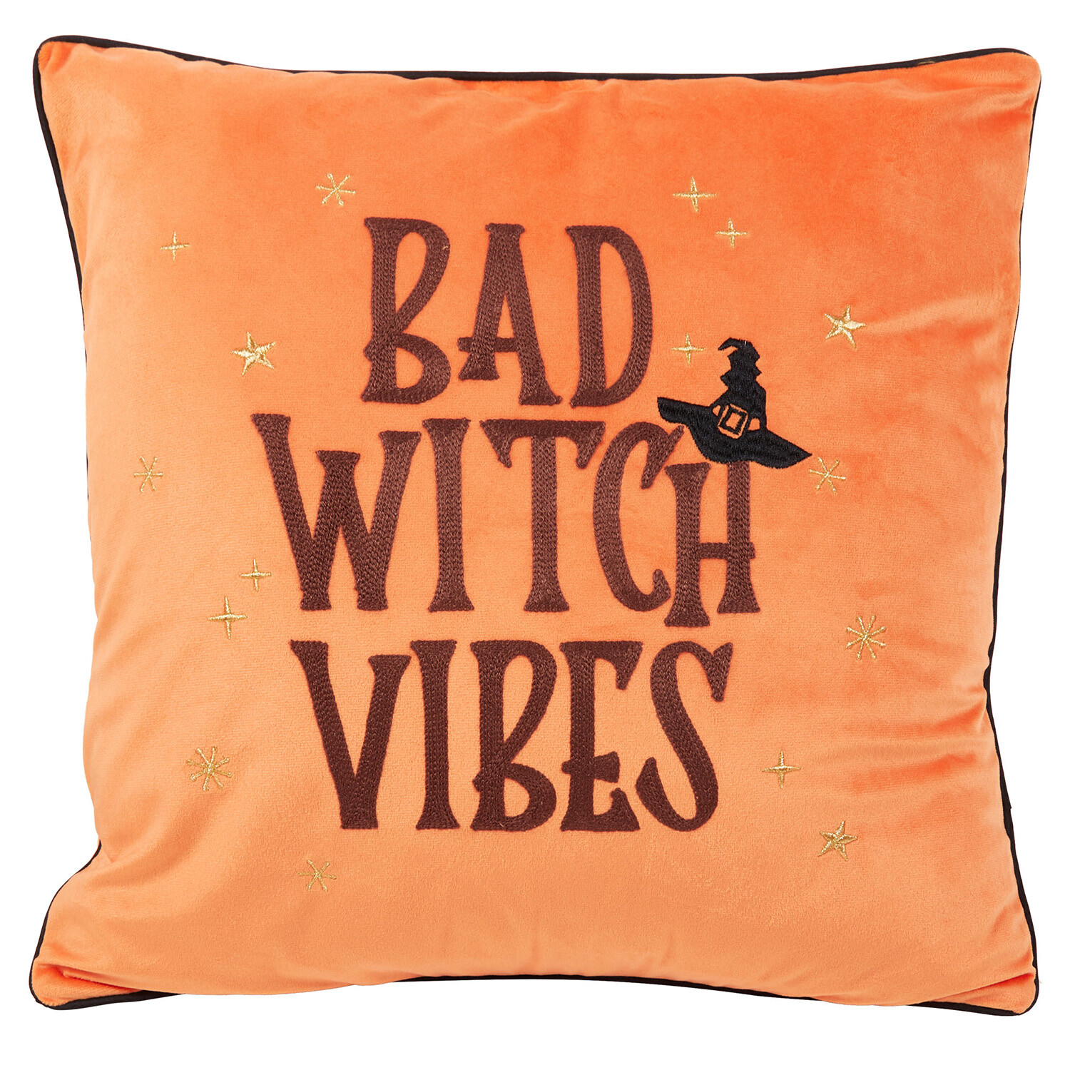 Enhance your seasonal decorations with this Halloween Bad Witch Vibes Cushion. Featuring bold capital letters that read “Bad Witch Vibes” and an adorable witch hat, this comfy cushion adds a fun and festive touch to your décor. It’s also finished with black piping to complete the seasonal look.