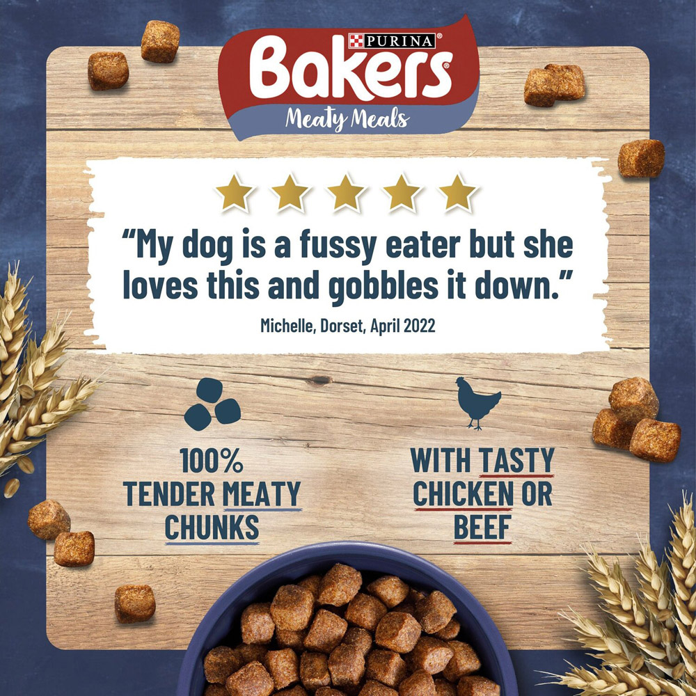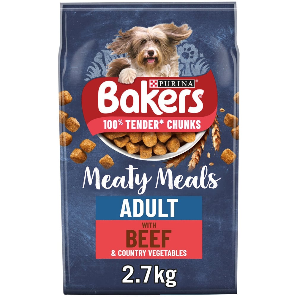 Ensure your canine companion enjoys every mealtime with Bakers Meaty Meals Beef and Country Vegetables Dry Adult Dog Food 2.7kg. Bursting with tender meaty chunks your dog will love, this food is packed with protein, vitamins, minerals, and whole grains to support overall health and development. Watch your furry friend wag their tail with joy. Feeding guidelines: Daily feeding guidelines in grams per day: size of dog daily feed g/day: Toy dog 1-5kg 40 - 125g. Small dog 5-10kg 125 - 195g. Medium dog 10-25kg 195 - 365g. Large dog 25-45kg 365 - 540g. Giant dog 45-70kg 540 - 725g. One half-pint mug holds approximately 100g of Bakers Meaty Meals Adult. To help keep your dog in an optimal body condition, adjust according to your dog's activity level, physical condition and individual needs. Ingredients: Cereals whole grains 45%, meat and animal derivatives 15% equivalent to 30% rehydrated meat and animal derivatives, with min. 14% beef. Nutritional additives IU/kg, vitamin A 17,500, vitamin D3 1,020, vitamin E 83, mg/kg, ferrous sulfate monohydrate Fe 72, calcium iodate anhydrous I 1.8, cupric sulfate pentahydrate Cu 8, manganous sulfate monohydrate Mn 5, zinc sulfate monohydrate Zn 100, sodium selenite Se 0.17, colourants and antioxidants.