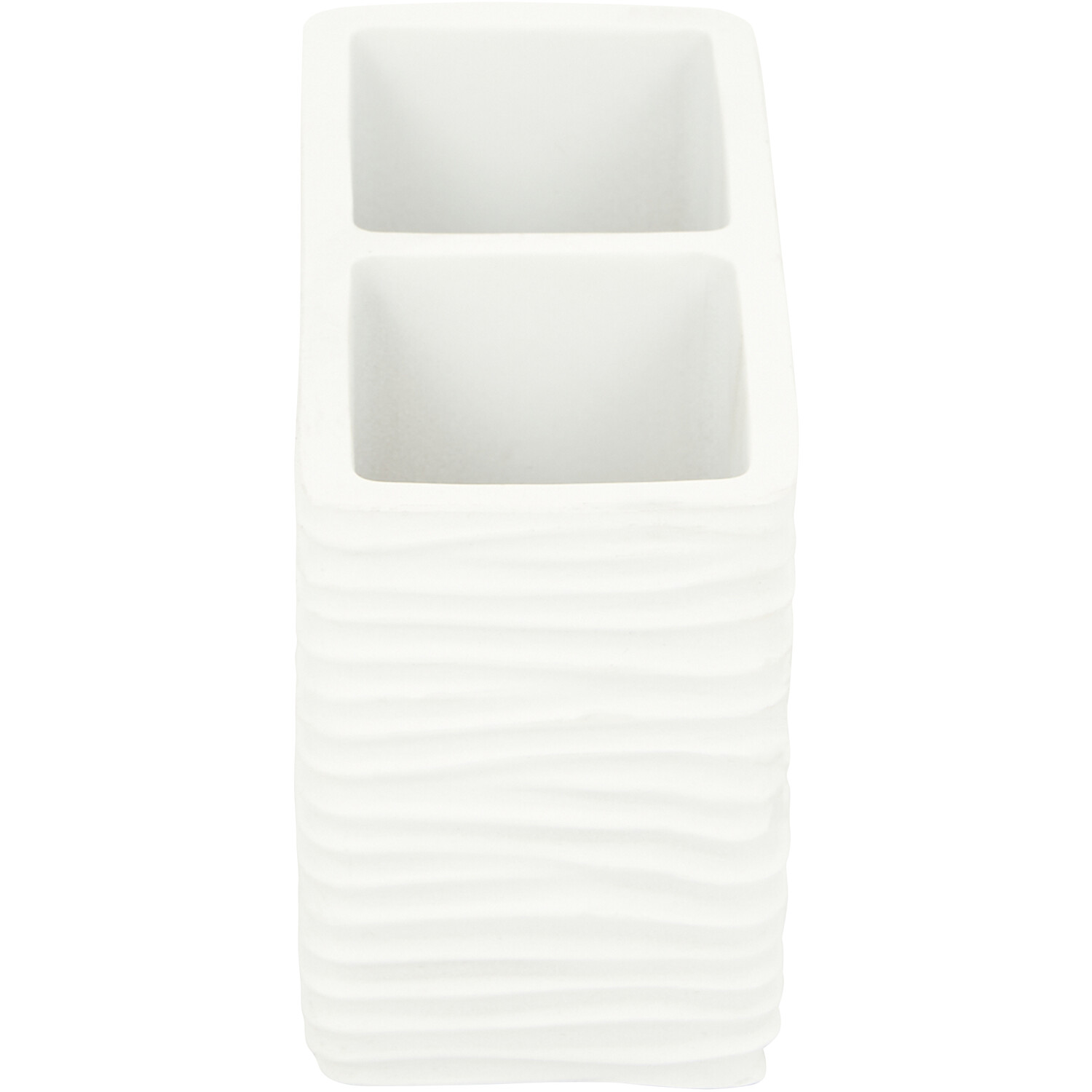 Add texture and elegance to your bathroom with this Bali Toothbrush Holder. Featuring a wavy surface design in classic white, it's easy to coordinate with your existing bathroom decor and can be paired with matching items for a more cohesive look. With two separate sections, it's perfect for hygienically and stylishly storing toothbrushes and toothpaste.
