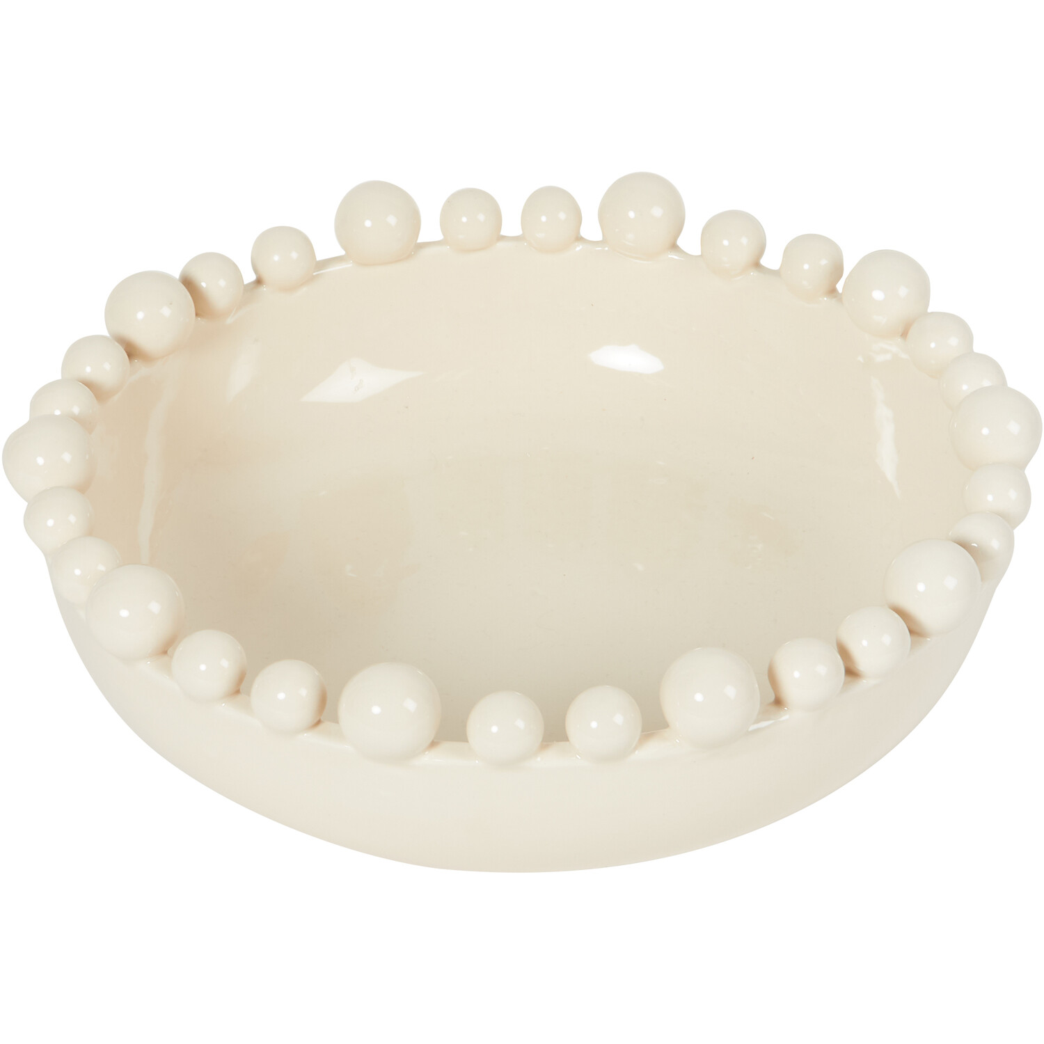The Ball Edged Bowl is a distinctive decorative accent for your living space. Its simple design and colour palette facilitate easy coordination, with a unique ball-edge detail that attracts attention. Ideal as a centrepiece for your coffee or accent table, it can hold decorative items like potpourri and glass pebbles or serve as a practical storage solution for essentials such as hair ties and keys. Height: 9cm. Diameter: 28cm. Weight: 750g. Material: Ceramic.