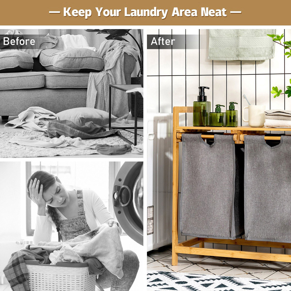 Transform your laundry routine with the Costway Single Shelf Natural Bamboo Laundry Hamper. Crafted from 100% natural bamboo, this durable and stable hamper offers a practical solution for sorting and storing laundry. It features two large sliding laundry bags to separate light and dark clothes, and a multifunctional top shelf ideal for storing laundry essentials or displaying decorative items. The removable bags ensure easy transportation to your washing machine, making laundry day less of a chore. With its easy assembly and convenient handles, this bamboo laundry hamper is a stylish yet functional addition to any home.
