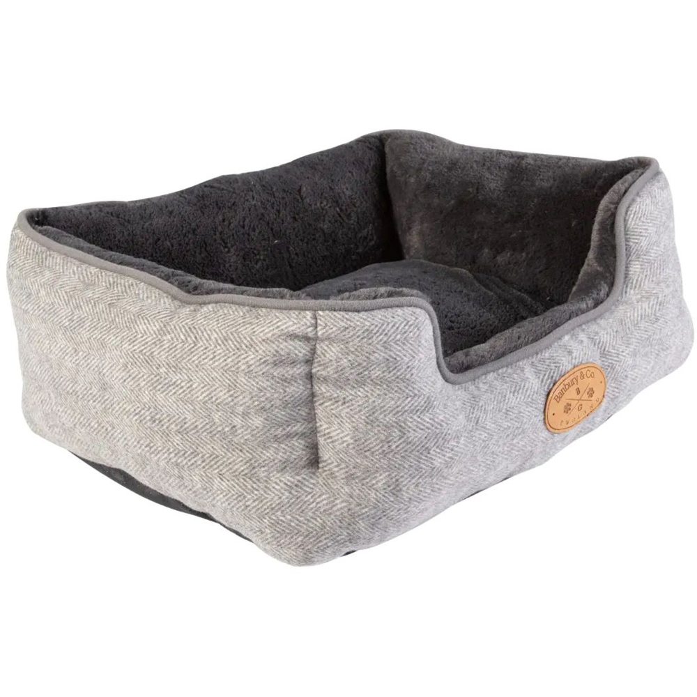 A cosy choice for any pet, this stylish bed is the perfect addition to your furry friend's nighttime routine. The square bed comes with a deeply filled base and high sides, and the indulgently soft plush filling provides your pet the best support for their neck and back. The neutral grey colour is perfect to suit any home, while the faux woollen herringbone pattern brings a little touch of style whether kept in the bedroom, kitchen, or lounge. This pet bed is fully machine washable at 30 degrees and has a non-slip base to help keep it firmly in place on hard floors. Ideal for your pet to relax in comfort and style.