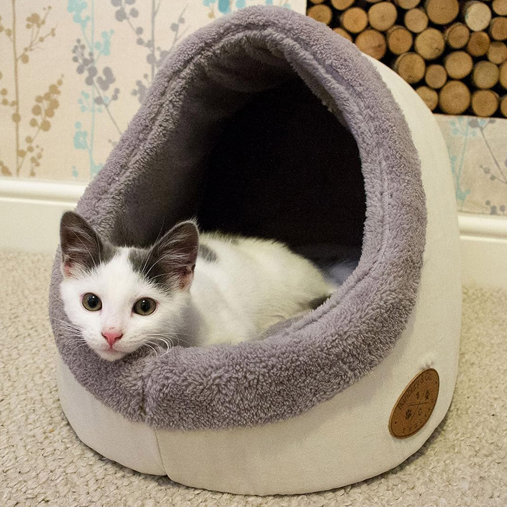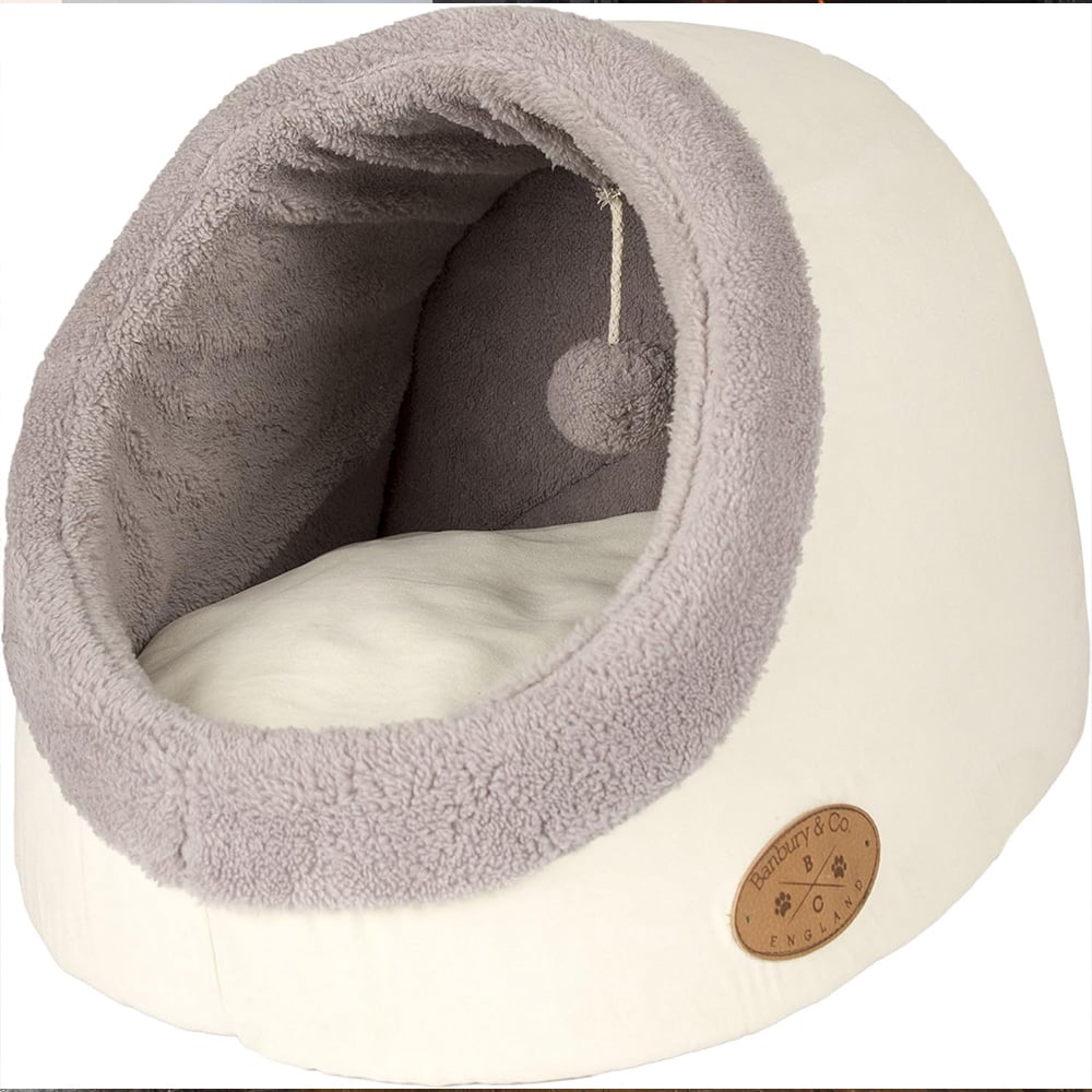 Discover the ultimate in pet comfort with the PU branded Banbury & Co cat igloo bed, designed specifically to keep your furry friend cozy and content. Featuring a removable cushion that makes cleaning effortless and a reversible colorway for style versatility, this bed caters to both practicality and aesthetics. Inside, the luxurious faux sheep shearling lining provides warmth and comfort, ensuring your pet feels snug and secure. Plus, the included entertaining teaser toy adds an extra layer of fun, making this bed the perfect retreat for your cherished companion. Size - 47cm x 37cm x 19cm.