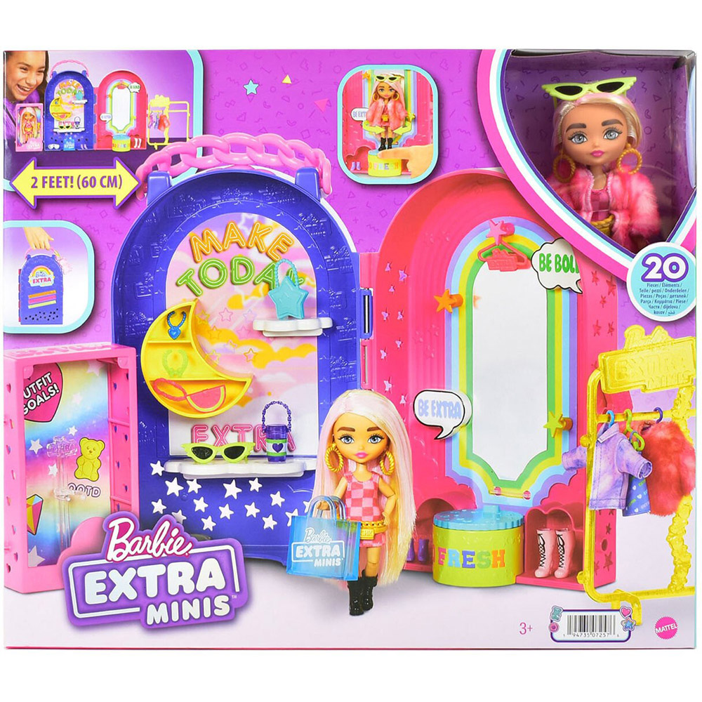 Unleash your child's imagination with the Barbie Extra Minis Boutique. Designed to inspire over-the-top fashion adventures, this vibrant playset is filled with features that encourage kids to create extraordinary looks for their Barbie dolls. When playtime is over, the boutique can easily be closed for convenience.