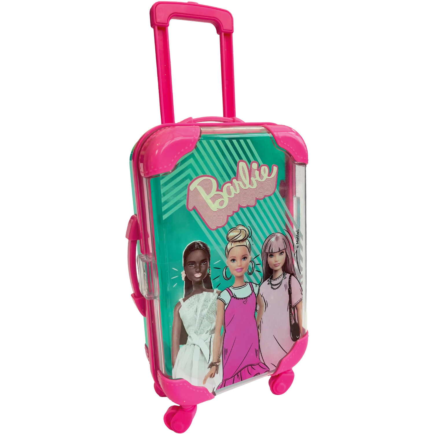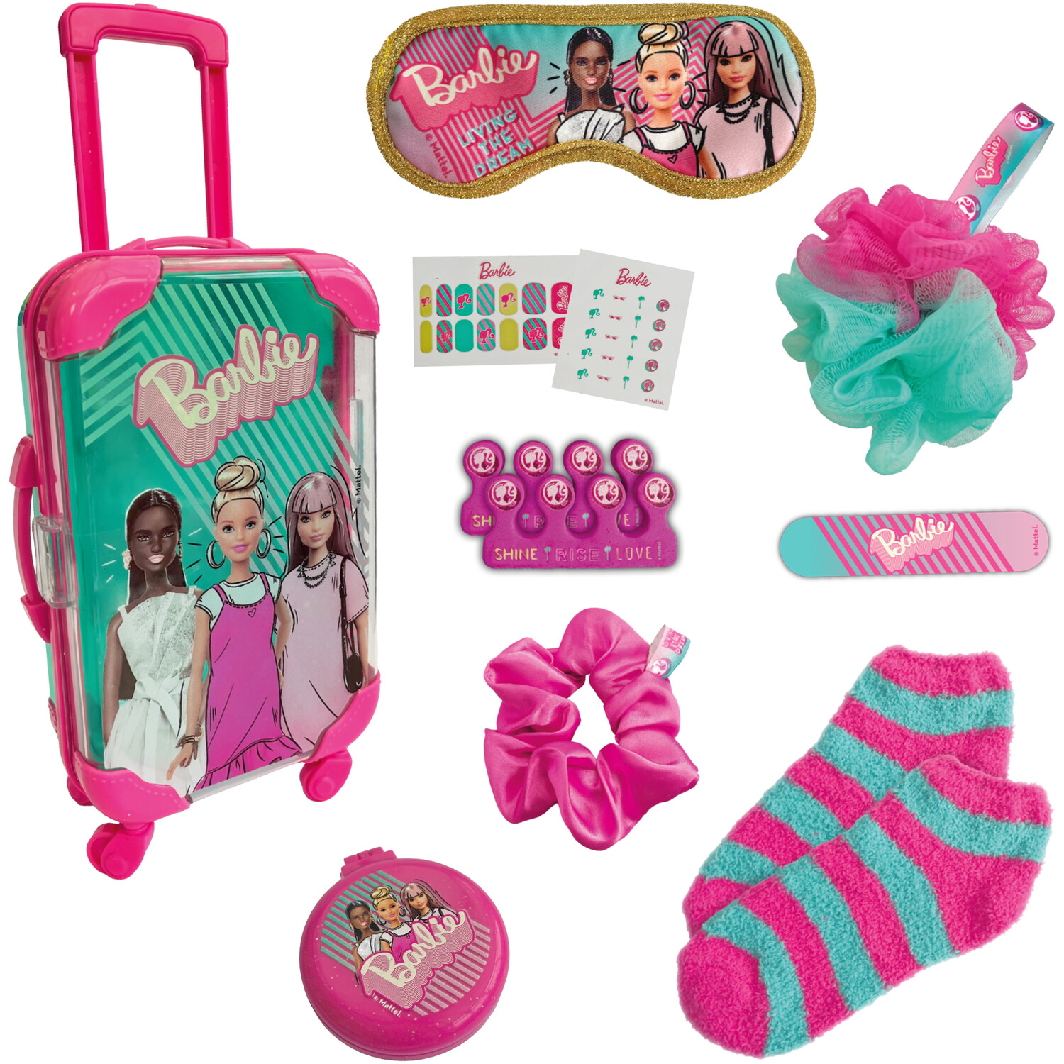 Barbie Sleepover Set Trolley Case features beautiful sleepover accessories for you, so you can have a sleepover in true Barbie style. The case includes two toe separators, a nail sticker sheet, a nail decal sticker sheet, a hairbrush with a mirror, one pair of fluffy ankle socks, a sleep mask, a shower puff, and a hair scrunchie. Everything is printed with a bright Barbie design and comes in a mini suitcase - ideal for taking with you on your next sleepover!