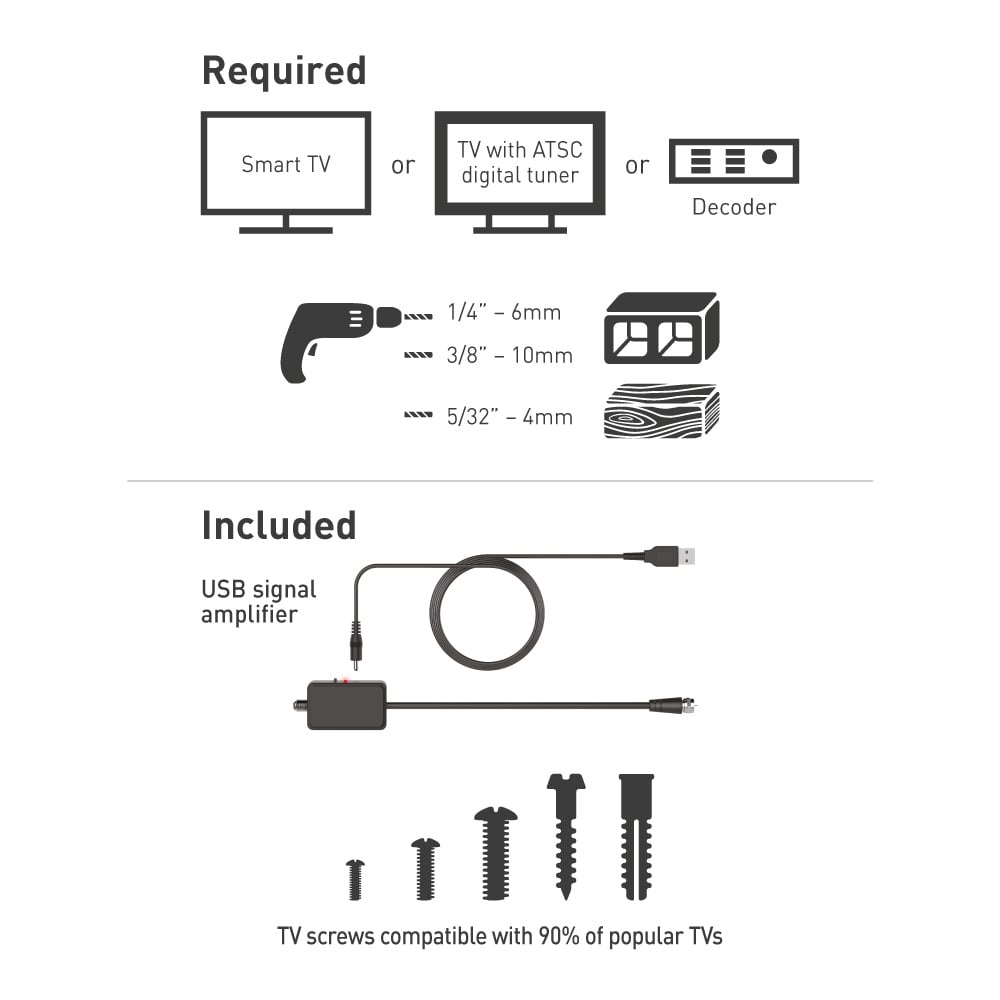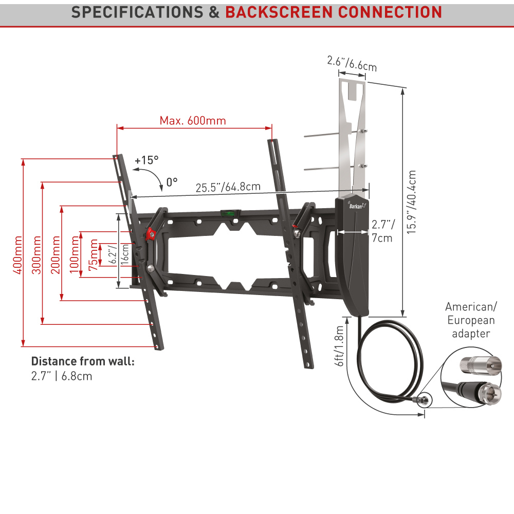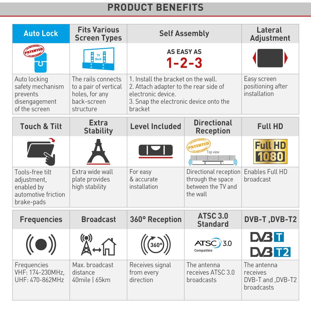 Select the best spot for placing your TV with the Barkan TV Wall Mount Bracket. This wall mount bracket is the world's first TV mount with an integrated TV antenna. It is an all-in-one solution for mounting your television to the wall, while the amplified integrated antenna allows you to watch free HDTV broadcasts. You can mount televisions from 19 inches up to 83 inches with a 50kg weight capacity. This patented mount is ideal for getting the best and unobstructed view of your screens, wherever you need entertainment. Get a better point of view whilst watching your television thanks to the tool free tilt from minus 5 degrees to 15 degrees. This innovative product eliminates the trouble of using two separate devices and creates a cleaner look in your living room, bedroom or anywhere in your house. The large mass of metal required for the TV mount creates a better reception than a regular stand-alone antenna with a range of 40 miles. The built-in coaxial cable connects to a smart TV or a decoder to allow the reception of countless HDTV channels. This mount includes a patented auto-locking mechanism to prevent disengagement of the screen from the wall. There are no cords or springs that might break in the auto locking mechanism, and it includes two hanging points on each side for a stable viewing position. Lifetime warranty.
