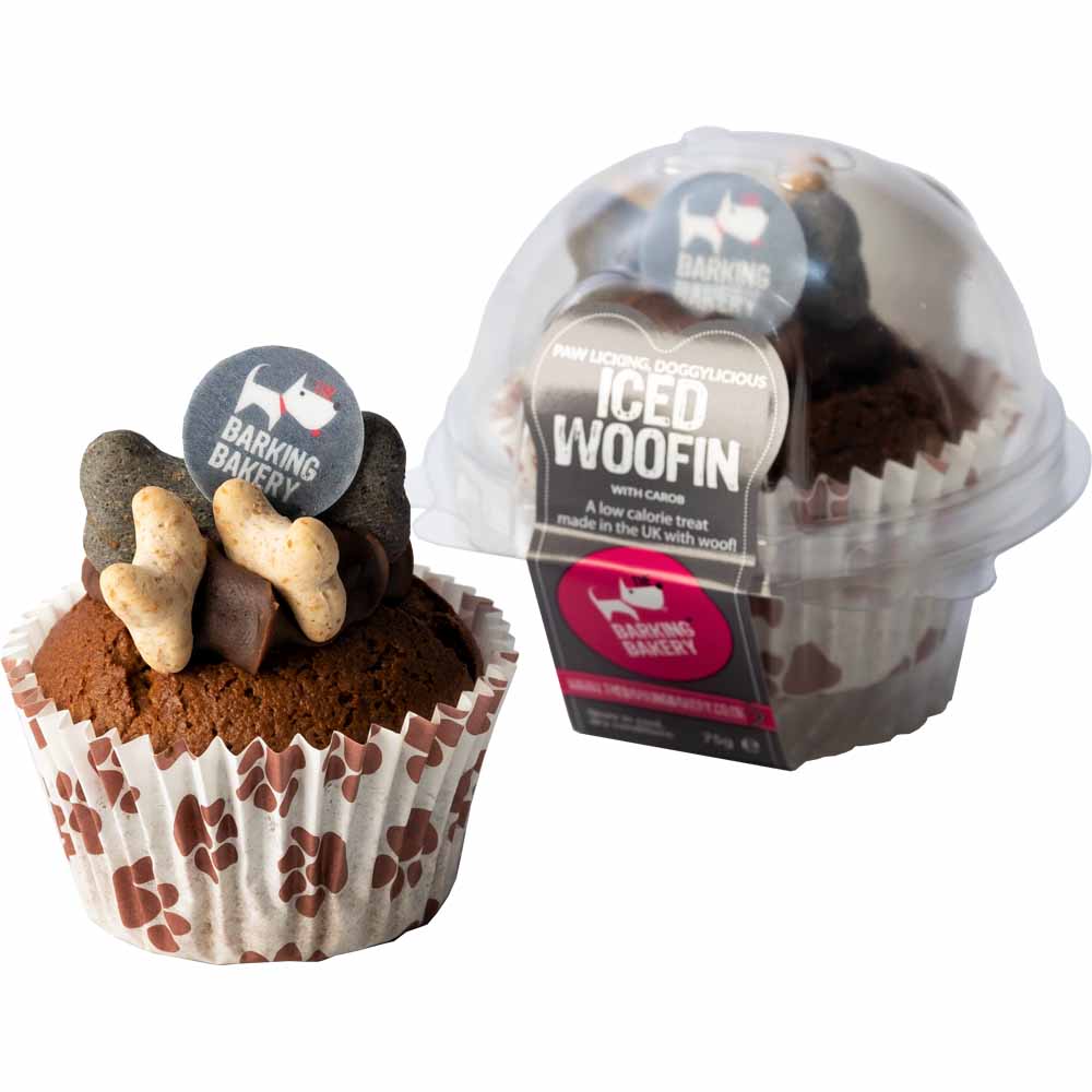 A doggylicious treat for your dog! The single Vanilla Iced Carob Woofin is really pawsome and will be enjoyed by your furry friends. The light and fluffy sponge is topped with a tail-swishing swirl of famous yoghurt frosting and decorated with crunchy bone and edible disc. This pawfect treat contains only 98 calories. Comes packed in a clear travel pod to keep it fresh and safe.