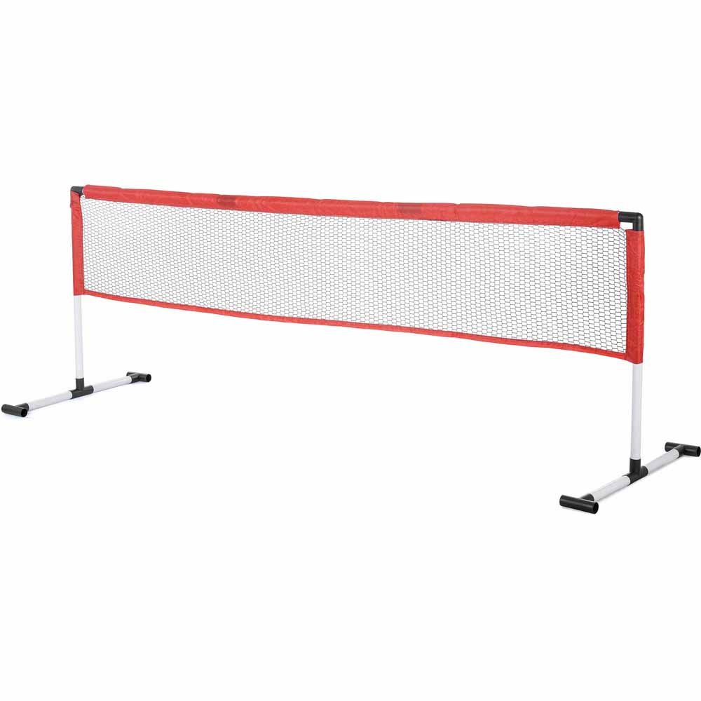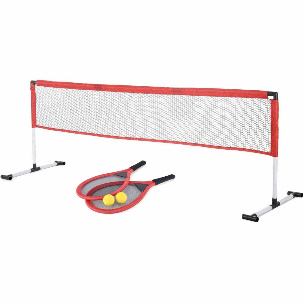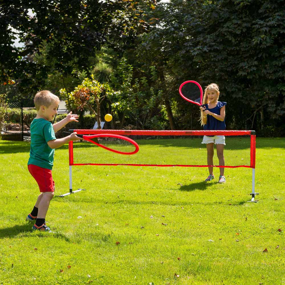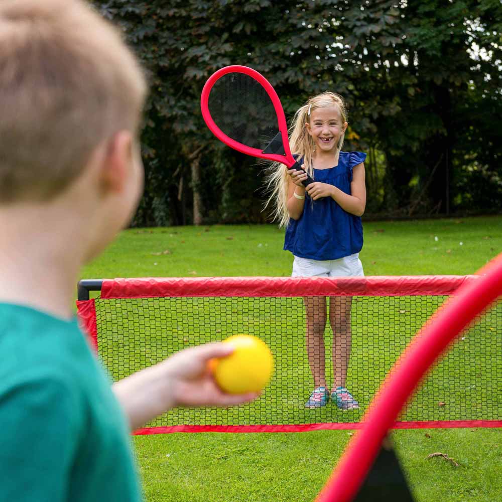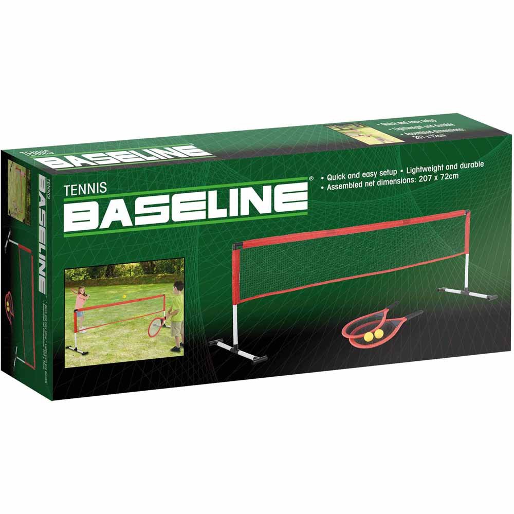 Enjoy a delightful game with the Baseline tennis set. It includes all the necessary equipment to begin a match, such as a net and posts, a set of gentle rackets, and two foam tennis balls. Simple to set up and dismantle, this tennis net set can be conveniently stored away when not in use. Ideal for kids, the soft rackets and balls allow them to hone their serving and volleying skills without the risk of injury.