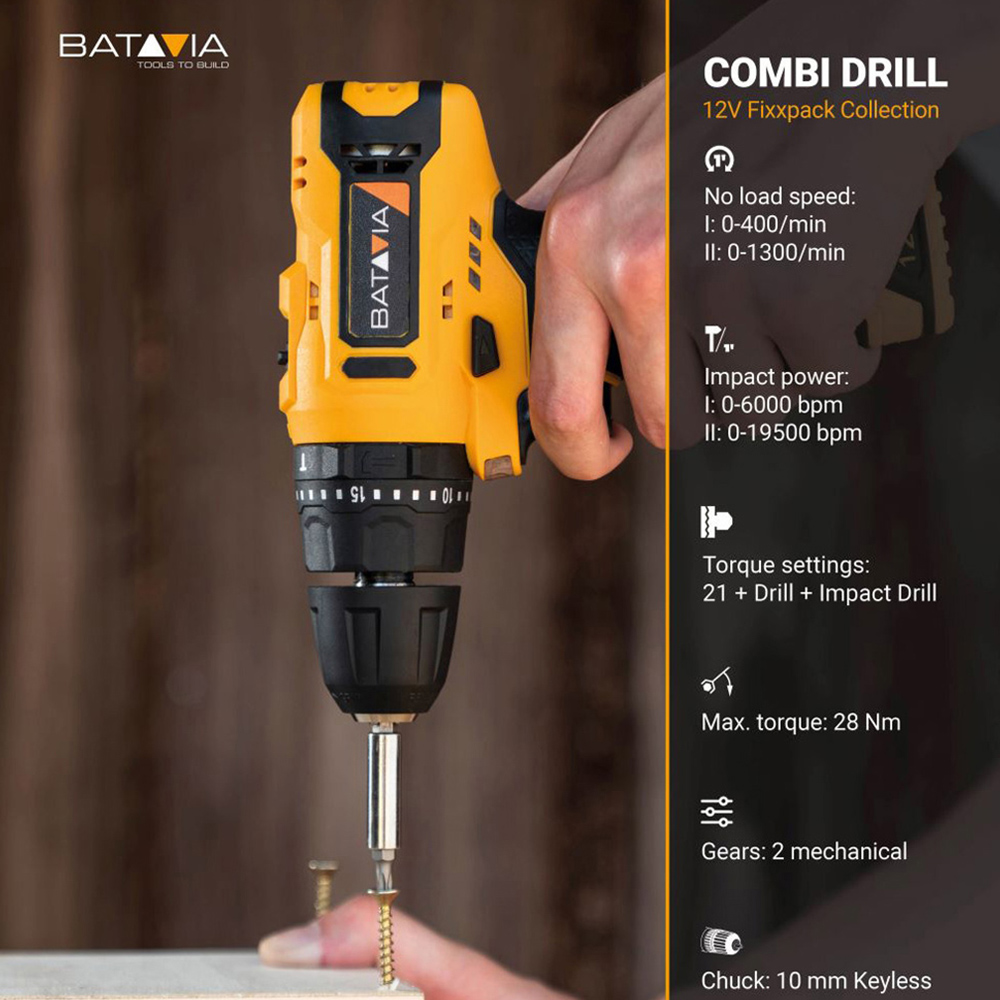 Experience efficiency with the Batavia FIXXPACK 12V Combi Drill. This tool offers adjustable torque settings for precise driving, ensuring it can match the requirements of any job. Equipped with two gears, it provides flexibility and speed control. The impact drill function excels in tough materials. Its compact and lightweight design makes it easy to handle even in tight spaces. A built-in LED light illuminates your work area for accuracy. Specifications: Chuck: 10mm Keyless. No Load Speed: 0-400/0-1,300/min. Impact Rate: 0-6,000/0-19,500/bpm. Torque Settings: 21 + Drill + Impact Drill. Max. Torque: 28Nm. Capacity: Metal 8mm, Wood 25mm, Concrete 6mm. Weight: 0.84kg. Please note: This unit does not include a battery and charger.
