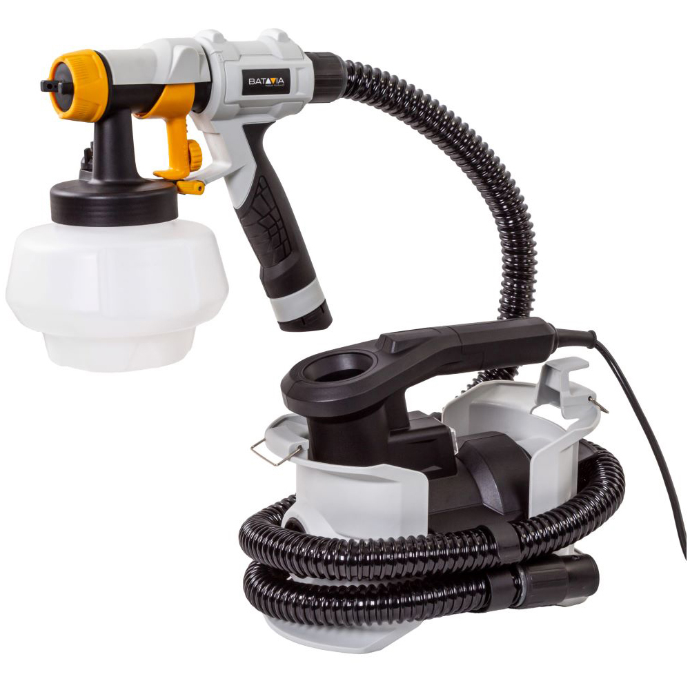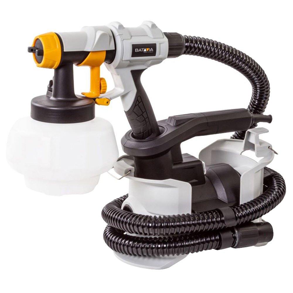 Presenting the Batavia HVLP Electric Paint Sprayer 700W, a versatile tool designed for paint applications. Operating at 700W and 240V, it provides consistent and adjustable paint flow without splashes, leakages, or blockages. Compatible with a wide range of paints, varnishes, stains and primers, it features a generous 1.2L fill capacity to handle large projects easily. It has a maximum blow rate of 1100ml/min and the ability to handle the paints with a viscosity of up to 150DIN-s.