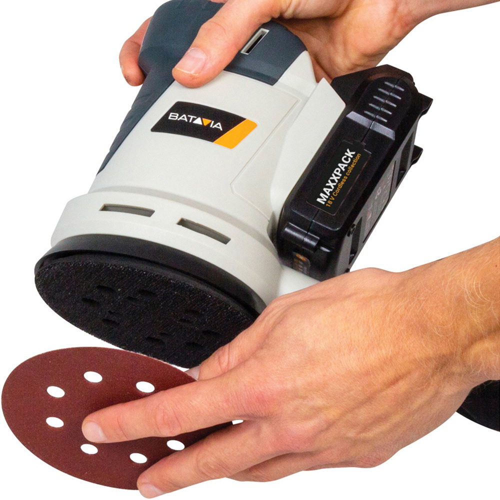 The Batavia MAXXPACK Orbital Sander 18V has a compact design with a low centre of gravity and even weight distribution. It's equipped with a soft grip for a comfortable, secure hold and a safe working experience. The micro hook and loop fastening provide a firm hold, keeping the sanding disc secure. The unit comes as a bare unit with no battery or charger supplied. Specification: No Load Speed: 12,000/min. Eccentricity: 2mm. Sanding Pad Size: Ø125mm. Weighted sound pressure level LpA: 67.3 dB (A). Weight: 1.4kg.