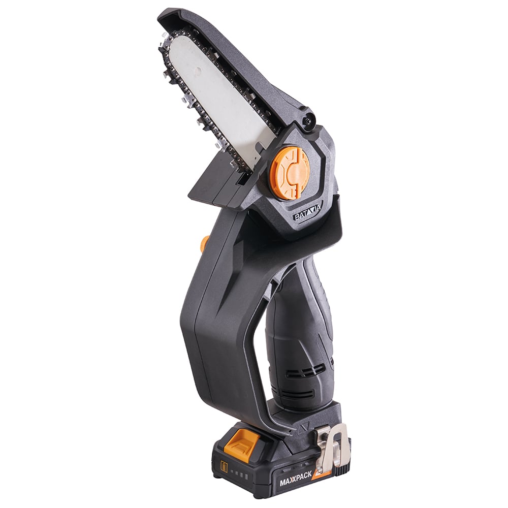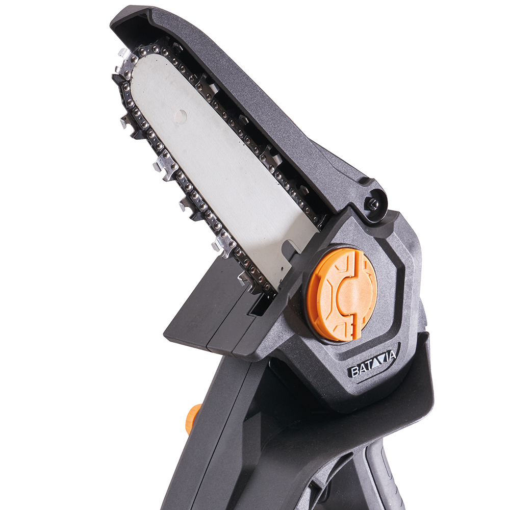 Conquer branches with comfort with the Batavia NEXXSAW One Handed Chainsaw 118mm. This lightweight chainsaw is meant for single-handed use, giving you greater control and precision in tight spaces. It allows you to cut through branches with ease, making this ideal for maintaining gardens. Switch between a straight 0-degree angle and 32-degree angle for downward sawing with just a simple twist. The included chain cover and handgrip safeguard you while operating the saw. The low kickback chain minimises the risk of sudden jolts. Supplied with: 1 x 18V 2.0Ah Li-ion Battery and 1 x Charger. Specifications: No Load Speed: 3,200/min. Chain Speed: 4.7m/s. Bar Length: Total 156mm, Effective 110mm. Max. Cutting Depth: 110mm.