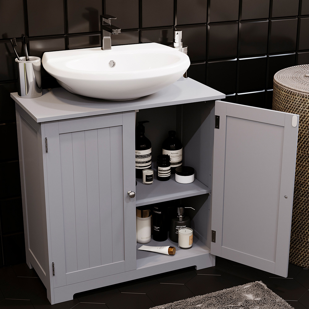 The Priano under sink floor-standing cabinet in grey is a stylish and practical addition to any bathroom, offering a blend of durability and modern design. Constructed from high-quality MDF and finished with a sleek grey paint, this cabinet ensures both robustness and a contemporary aesthetic. The unit features two doors that open to reveal two spacious shelves, providing ample storage space for bathroom essentials such as folded towels, soaps, and shampoos. The top of the cabinet offers additional versatility, serving as an ideal spot for extra items or decorative pieces. Designed to fit seamlessly under the sink, the Priano cabinet maximizes space and enhances the overall organization and look of your bathroom.
