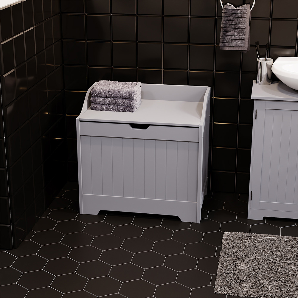 The Priano laundry chest is an elegant and functional storage solution designed to enhance both the organization and style of your bathroom or laundry room. Constructed from high-quality MDF and finished with a sleek, painted surface, this chest combines durability with a modern, clean look. It features a spacious interior that offers ample room to store a variety of items, including towels, shampoos, soap bars, and other toiletries, ensuring your essentials are neatly organized. The chest includes a lid that securely closes, providing a discreet and tidy appearance by keeping your items hidden from view. This thoughtful design not only maximizes storage space but also maintains a refined aesthetic, making it a practical addition to any space.