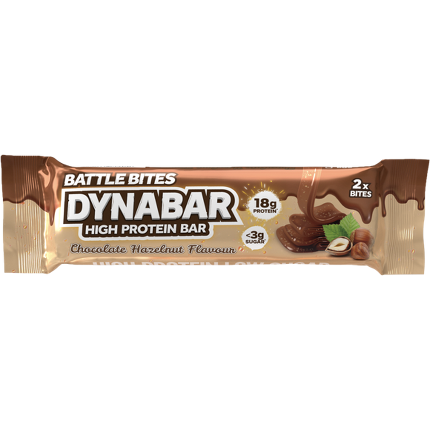 The Battle Bites Chocolate Hazelnut DynaBar is a hazelnut flavour protein dough with a white caramel filling, topped with a layer of caramel and cocoa soya nuggets, enrobed in a milk chocolate flavour coating, topped with roasted hazelnuts, with sweeteners. The bites are high in protein and low in sugar - perfect for those who like to stay active.