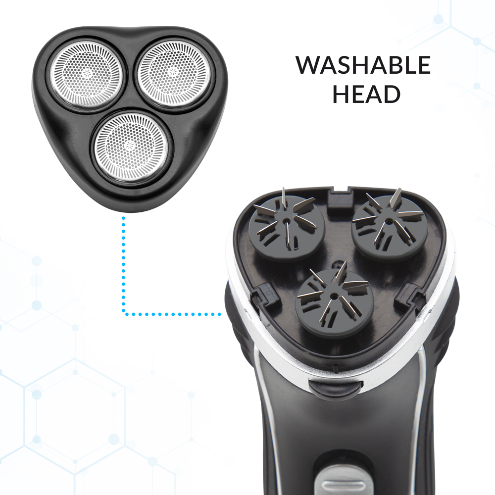 The Bauer 3-Head Rotary Shaver is a versatile grooming tool that caters to all your personal grooming needs. With its three stainless steel heads, it ensures a smooth and comfortable shave. The flexible rotary head design on each of the heads adds to the overall shaving experience. This shaver can be used on various parts of the body, including the head, face, and body. It also comes with a convenient pop-up sideburn trimmer, allowing you to achieve precise grooming results. The shaver features a charging indicator light and an ergonomic grip for easy and comfortable use. Cleaning is a breeze as the shaver head can be easily removed for washing. Being cordless, it offers enhanced convenience, allowing you to use it anywhere without the need for a nearby socket. The shaver can be recharged using the included A/C charging adaptor, and with a charge time of eight hours, it can be safely left plugged in overnight for use in the morning. Experience a reduction in cuts and irritation with this efficient shaver. Its compact dimensions of 7.5 x 5.5 x 14.5cm make it easy to handle and store.