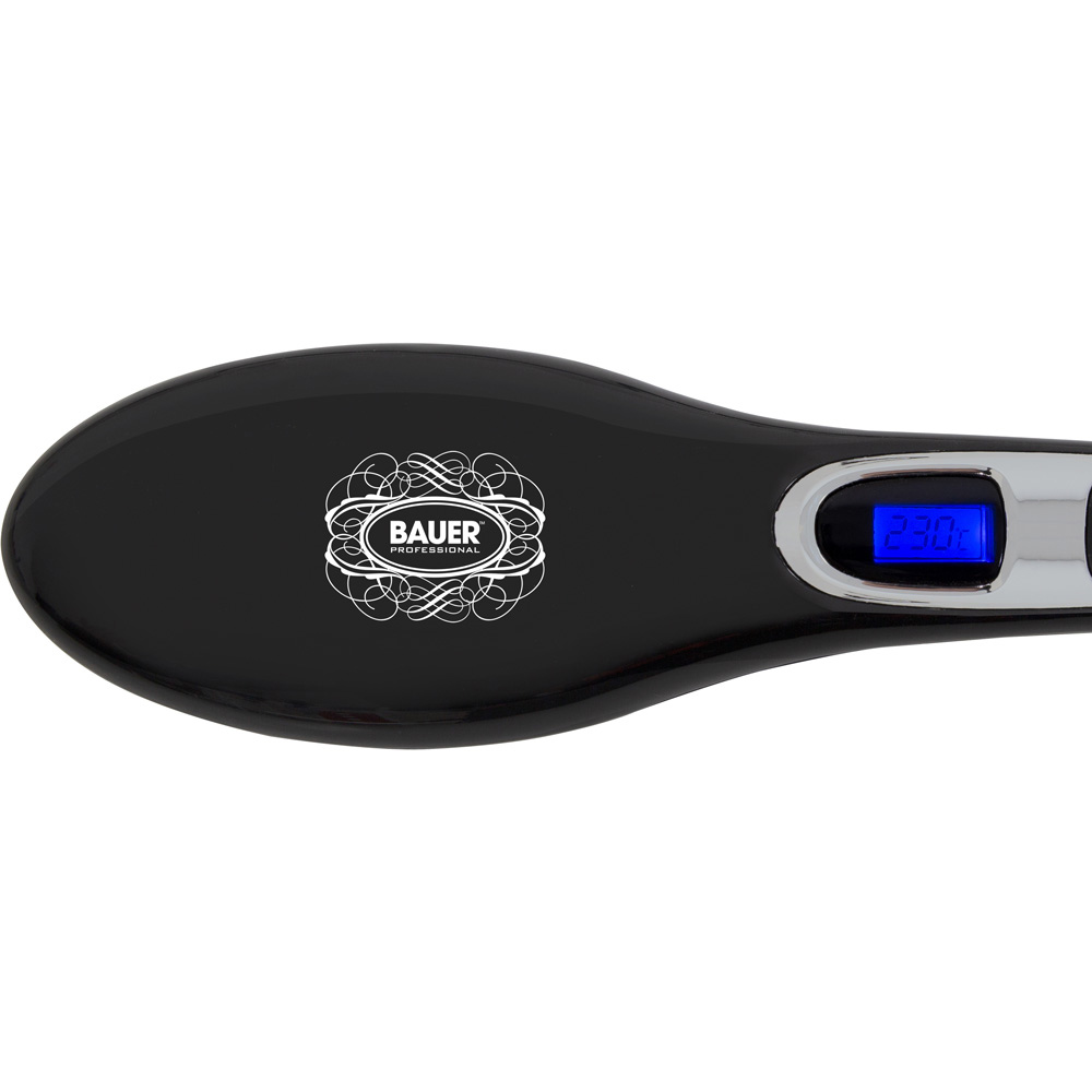 Style your hair at home like a salon with this Ceramic Hair Straightener Brush by Bauer Professional. This black-coloured professional standard hair straightening brush provides salon-quality, smooth and sleek straightened hair in minutes. It utilises innovative rapid heat technology that will allow the rubber-tipped ceramic bristles to rise to a temperature of up to 230°C, delivering straight hair with every brushed stroke. It features an LCD digital display on the handle that will showcase the current temperature of the bristles. The brush also features a 360° Swivel Cord that allows you to brush your hair in a genuinely free-form manner. This ceramic-coated hairbrush features a safety mechanism that automatically shuts off the heating elements when they reach maximum temperature, allowing you peace of mind.