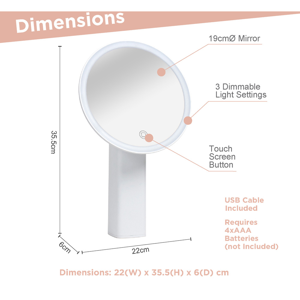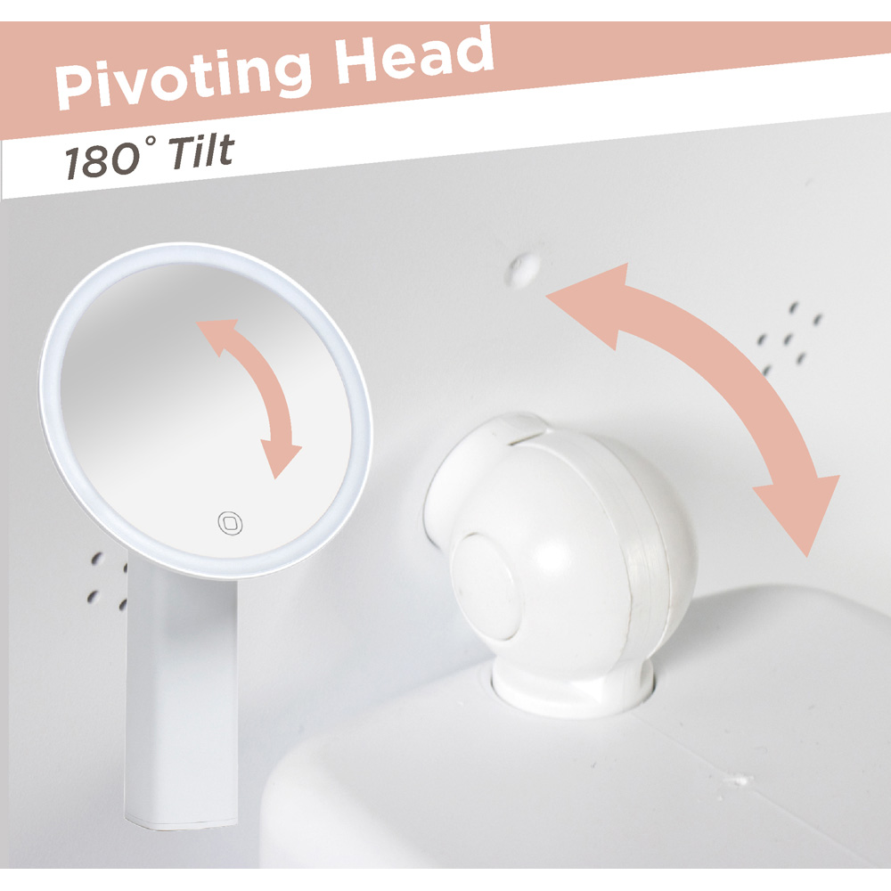 Make a beautiful addition to your dressing table with this Premium LED Rechargeable Mirror by Bauer Professional. This wireless, freestanding round mirror with a ring light is the perfect accessory for a bedroom dressing table or bathroom. It has a brushed white finish and can complement any modern home decor. The vanity mirror has a touch screen with three light settings, which you can choose between a calm, warm, or natural glow to illuminate your face and enable you to create flawless makeup looks. The mirror is USB rechargeable for convenience and comes with a charging cable. It fully charges in just two hours, and the battery life lasts up to four hours, so you can take it on the go. It has an adhesive base, which can be reused if you need to move your mirror. This provides secure placement of the mirror without damaging the surface it’s placed on. If the adhesive section becomes dirty or stickiness has reduced, it can be wiped clean with a damp cloth to reset the adhesive surface.
