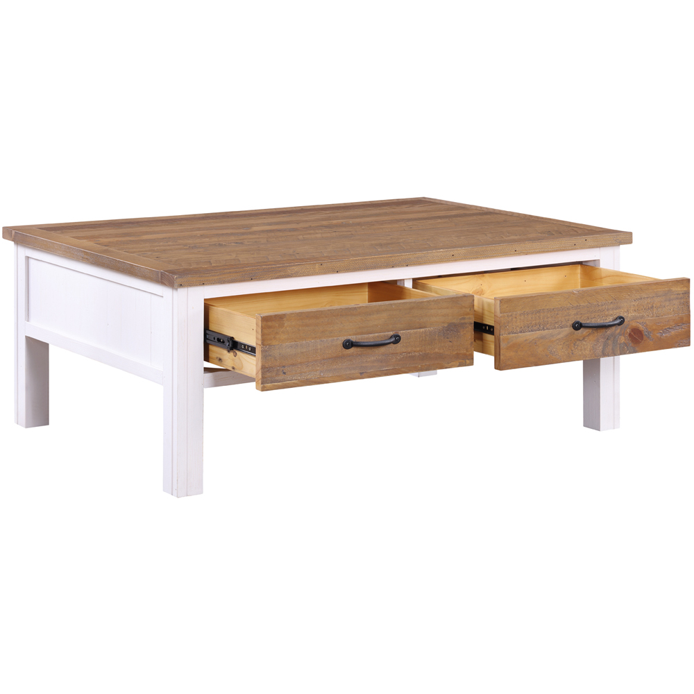 Elegant and functional, the Baumhaus 4 Drawer Splash of White Wooden Coffee Table brings sophistication to any space. Featuring two drawers on either side with steel handles, it seamlessly blends style and practicality. It undergoes multiple hand-spraying processes to achieve a flawless finish that contrasts beautifully with the natural wood. The clear, durable lacquer coating highlights the unique wood grain, preserving its distinctive character. The white colourway and steel handles add a touch of class, elevating your decor. Overall size: H45 x W120 x D80cm, Drawer dimensions: H20 x W52 x D35cm.