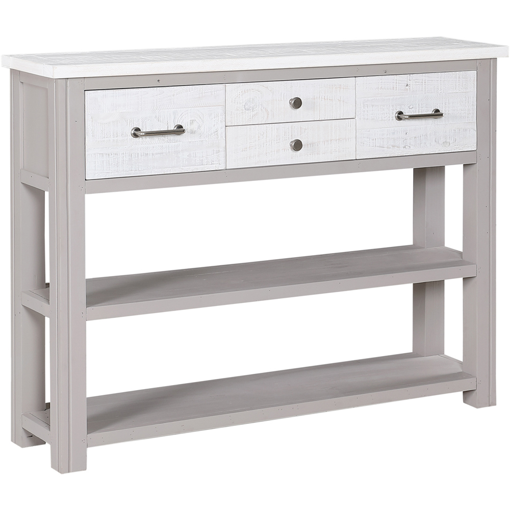 Elevate your study room with the Baumhaus Greystone 2 Shelf 4 Drawer White Finish Low Bookcase. Compact yet stylish, seamlessly blends contemporary design with practicality, making it an ideal addition to smaller living spaces or hallways. Boasting two large and two small drawers at the top and two shelves at the base, it offers ample storage for various items. Crafted with clean lines and a fashionable paint finish, is expertly handcrafted from reclaimed weathered wood, featuring a captivating colourway that adds a touch of sophistication to any room. Crafted by skilled artisans who carefully select reclaimed wood to enhance its rustic appearance, grain markings, knots, and subtle colour variations, ensuring that every item possesses a unique charm. The painted sections undergo multiple hand spraying sessions to achieve a flawless, contrasting finish against the natural wood, resulting in a visually striking masterpiece that exudes elegance. To maintain the allure of the reclaimed timber, it is coated with a durable clear lacquer that not only protects but also accentuates the wood grain of each piece. The addition of a grey colourway and steel accent handles infuses the furniture with character, elevating your home decor with timeless allure and individuality. Arrives fully assembled and is backed by a five-year manufacturer's guarantee, ensuring both quality craftsmanship and peace of mind. Overall dimensions: H90cm W120cm D30cm, shelf dimensions: H30cm W108cm D28cm, large drawer dimensions: H20cm W34cm D26cm, and small drawer dimensions: H10cm W34cm D26cm.