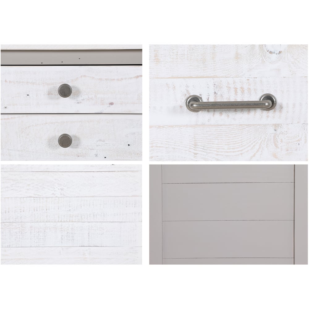 Elevate your living space with a Baumhaus Greystone Single Shelf 4 Drawer Widescreen Grey Television Cabinet. For those seeking a TV stand that combines practicality with contemporary flair. It is tailored to accommodate TVs up to 50 inches wide, this cabinet features two drawers adorned with sleek steel handles and an open shelf for additional storage or display. Crafted with precision and style, the Greystone range boasts clean lines and a fashionable paint finish, meticulously handcrafted from reclaimed weathered wood with a striking contrast in the colourway, ensuring each piece exudes a distinct charm. Through careful selection and meticulous hand-spraying techniques, the painted sections of the furniture achieve a flawless, contrasting finish against the backdrop of the natural wood, resulting in visually captivating pieces that stand as true works of art. To safeguard the intrinsic beauty of the reclaimed timber, a durable clear lacquer is applied, enhancing the individual character of each piece while providing lasting protection. The inclusion of steel accent handles in an elegant grey colourway adds a touch of sophistication, elevating home decor with timeless allure and personality. Delivered fully assembled. Backed by a five-year manufacturer's guarantee it exemplifies both quality craftsmanship and enduring style. Overall size: H47cm W180cm D40cm, drawer dimensions: H20cm W40cm D36cm.