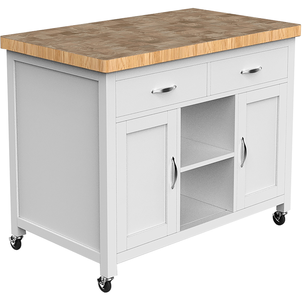 Upgrade your kitchen with Baumhaus Kitchen Island 2 Door 2 Drawer and 2 Shelf White Cabinet with Butcher Block. It offers extra storage and preparation space with lockable castors for easy mobility. The oak top and cream paint finish seamlessly complement any modern kitchen. Crafter from end grain wood, the butcher's block worktop is known for its strength, durability, and natural antibacterial properties, finished with a protective coating to highlight the wood's natural beauty. It measures H90 x W110 x D65cm, with drawers at H14 x W60 x D55cm, cupboard dimensions: H56cm W31cm D65cm and shelf dimensions: H34cm W31cm D65cm. It is delivered fully assembled. Backed by a comprehensive 5-year warranty, it guarantees quality and reliability.