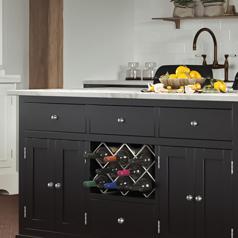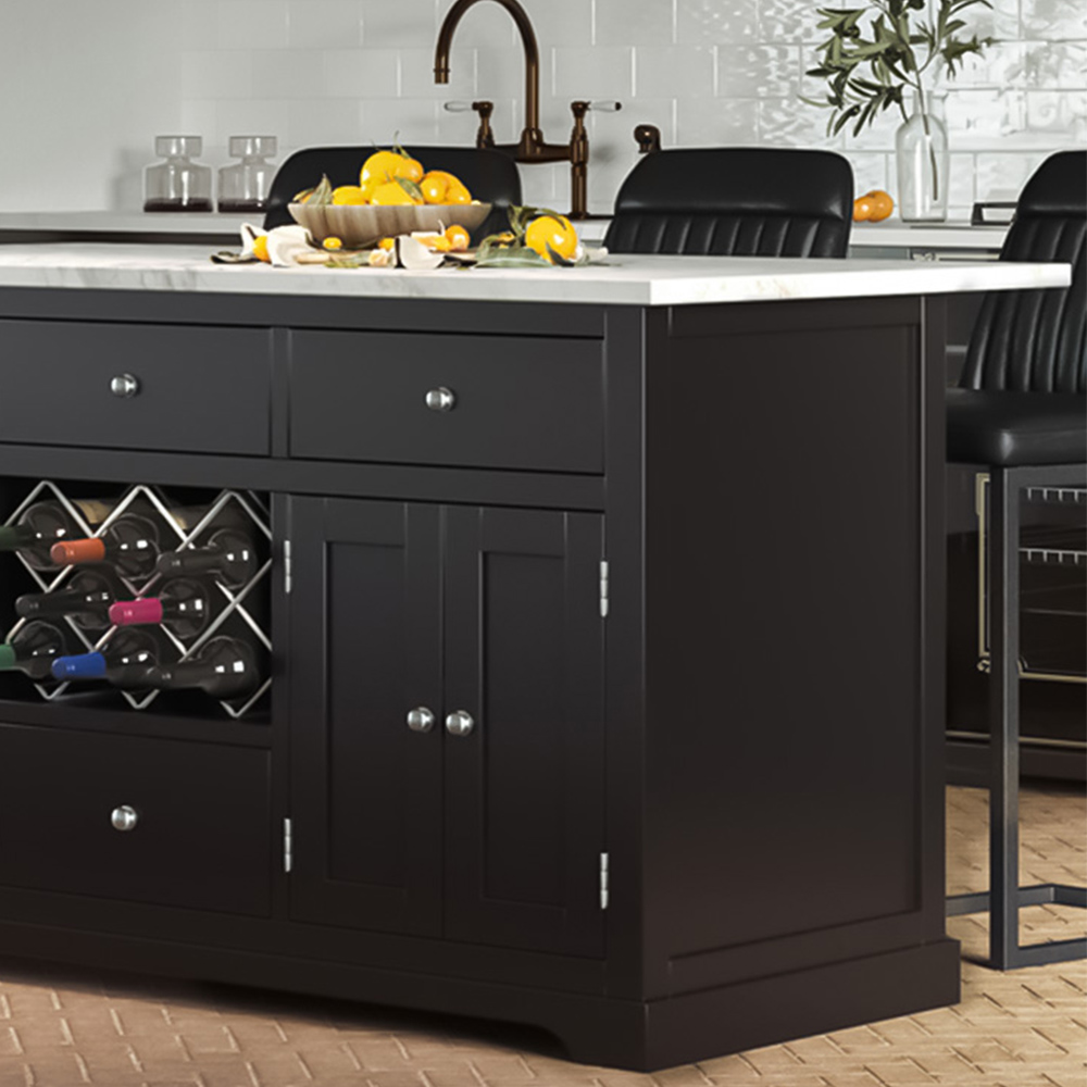Bring functionality and elegance to your kitchen with the Baumhaus Kitchen Island 4 Door 4 Drawer Black Cabinet with White Granite Worktop. It is a stylish and multifunctional kitchen island, ideal for storage, food preparation, casual dining or a central point for socialising with family and guests. The granite worktop provides a long-lasting and robust surface while in the middle of the unit, two sturdy painted metal wine racks will hold a total of 16 of your favourite bottles (8 bottles on each side).