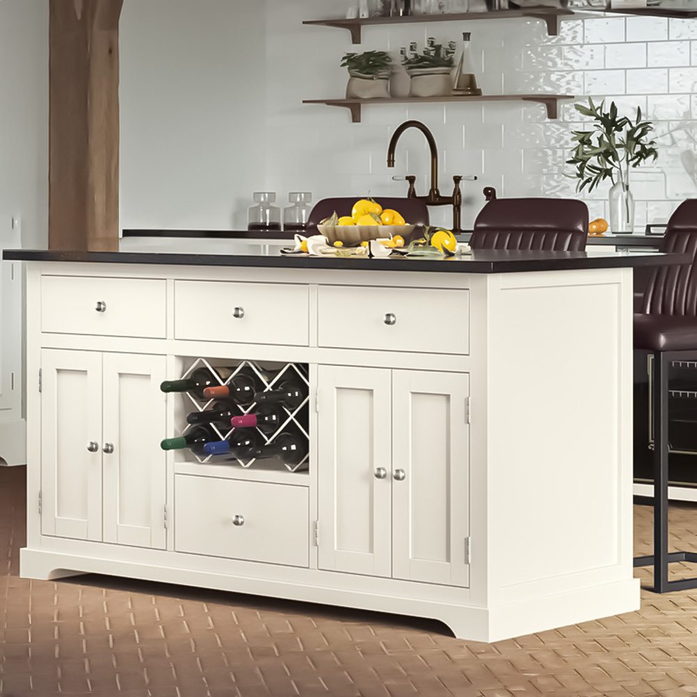Bring functionality and elegance to your kitchen with the Baumhaus Kitchen Island 4 Door 4 Drawer Cream Cabinet with Black Granite Worktop. It is a stylish and multifunctional kitchen island, ideal for storage, food preparation, casual dining or a central point for socialising with family and guests. The granite worktop provides a long-lasting and robust surface while in the middle of the unit, two sturdy painted metal wine racks will hold a total of 16 of your favourite bottles (8 bottles on each side).