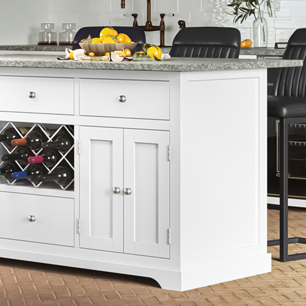 Bring functionality and elegance to your kitchen with the Baumhaus Kitchen Island 4 Door 4 Drawer White Cabinet with Grey Granite Worktop. It is a stylish and multifunctional kitchen island, ideal for storage, food preparation, casual dining or a central point for socialising with family and guests. The granite worktop provides a long-lasting and robust surface while in the middle of the unit, two sturdy painted metal wine racks will hold a total of 16 of your favourite bottles (8 bottles on each side).