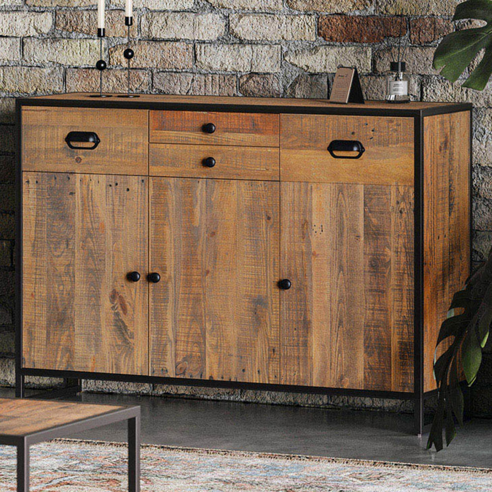 Combining contemporary aesthetics with ample storage capacity, the Ooki 3 Door and 4 Drawer Sideboard from Baumhaus stands out as a centrepiece in any living or dining area. Featuring three spacious cupboards, each equipped with a middle shelf, and four drawers adorned with stylish steel handles, this sideboard offers both functionality and sophistication. Being modular, it provides the flexibility to customize your space according to your needs. Crafted with a unique distressed finish, the reclaimed wood design exudes an aged charm, infusing your home with a sense of authenticity and character. By utilizing reclaimed materials, this unit not only promotes environmental sustainability but also adds a touch of history and individuality to each piece. The warm, natural brown hue of the rustic wood complements various colour schemes and interior styles, while panel detailing adds depth and visual interest to the design. Contrasted with the smooth matte finish of the metal accents, the texture of the reclaimed wood is enhanced, creating a harmonious blend of modern and rustic elements. This sideboard exemplifies industrial chic with its sturdy construction and contemporary design. Crafted from environmentally friendly reclaimed wood and steel, it ensures durability and longevity while making a stylish statement in your home. Delivered fully assembled for your convenience, it is backed by a five-year guarantee, assuring quality and satisfaction. Dimensions: H80 x W112 x D35cm.