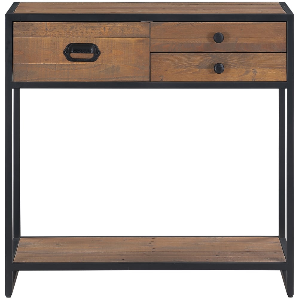 Infuse style into your space with the Baumhaus Ooki 3 Drawer Single Shelf Console Table, a stunning piece designed to seamlessly blend against any wall while providing ample storage. Boasting one large and two small drawers, along with a convenient base shelf, this console table ensures that all your essentials are easily accessible as you step out the door. Crafted with a distinct distressed finish, the reclaimed wood emanates a timeless vintage allure, infusing your home with character and charm. Not only does the use of reclaimed materials promote sustainability by reducing waste, but it also imbues each piece with a sense of history and individuality. The warm, natural brown tones of the rustic wood complement a variety of colour schemes and interior styles, while panel detailing adds depth and visual intrigue to the design. Contrasted with the smooth matte finish of the metal accents, the texture of the reclaimed wood is emphasized, creating a harmonious blend of rustic and contemporary elements. This small console table embodies the ideal fusion of industrial aesthetics, robust construction, and modern appeal. Crafted from environmentally friendly reclaimed wood and steel, it offers durability and longevity while making a stylish statement in your hallway. Delivered fully assembled for your convenience, it is backed by a five-year manufacturer's guarantee, ensuring your satisfaction and peace of mind. Dimensions: Overall size: H79 x W80 x D35cm.