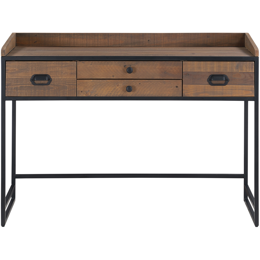 The Ooki 4 Drawer Dressing Table from Baumhaus seamlessly blends contemporary design with practical functionality. Its compact size makes it ideal for a home office setup, while also serving as a stylish dressing table in a minimalist bedroom or a console table in a hallway. The desk features a sleek splashback rim around the back and side edges, and the drawers are adorned with either steel cup handles or knobs. Notably, one of the smaller drawers in the centre is equipped with a lockable drop-down front, doubling as a convenient keyboard tray to maximize workspace. Being modular, this desk offers versatility, allowing for customizable layouts to suit your space perfectly. Crafted from reclaimed wood, the Ooki collection boasts a unique distressed finish that lends it an antique allure, adding character to any room. This eco-conscious approach not only reduces waste but also infuses each piece with a rich sense of history and individuality. The warm, natural brown tone of the rustic wood complements a variety of colour schemes and interior styles, while panel effect detailing adds depth and visual interest. Complementing the wood's texture, the smooth matte finish of the metal accents provides a modern contrast. It epitomizes a harmonious blend of industrial aesthetics with a sturdy and contemporary design. Delivered fully assembled for immediate use, the table comes with a five-year manufacturer's guarantee, ensuring longevity and quality craftsmanship. Dimensions: 80 x 50 x 122cm.