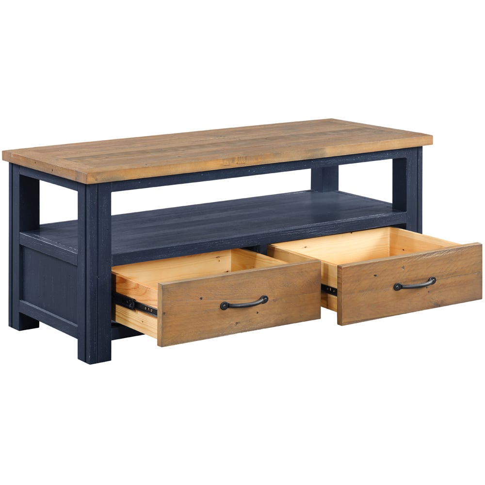 For those seeking a TV stand that combines practicality with contemporary flair, this Baumhaus Splash of Blue 2 Drawer Single Shelf Widescreen TV Cabinet is an excellent option. Designed to accommodate a 50-inch TV, this piece is both stylish and practical. It features two spacious drawers with sleek steel handles, providing ample storage. An open shelf offers convenient space for other entertainment devices. Its clean lines and contemporary paint finish make it perfect for modern interiors. Handcrafted from reclaimed weathered wood, the painted sections are meticulously sprayed and coated with a clear, durable lacquer for longevity. Delivered fully assembled within five to seven working days with a five-year manufacturer's guarantee, it promises durability and a touch of elegance to your home. Dimensions: The unit measures 47cm x 110cm x 45cm and the drawer measures 20cm x 45cm x 40cm.
