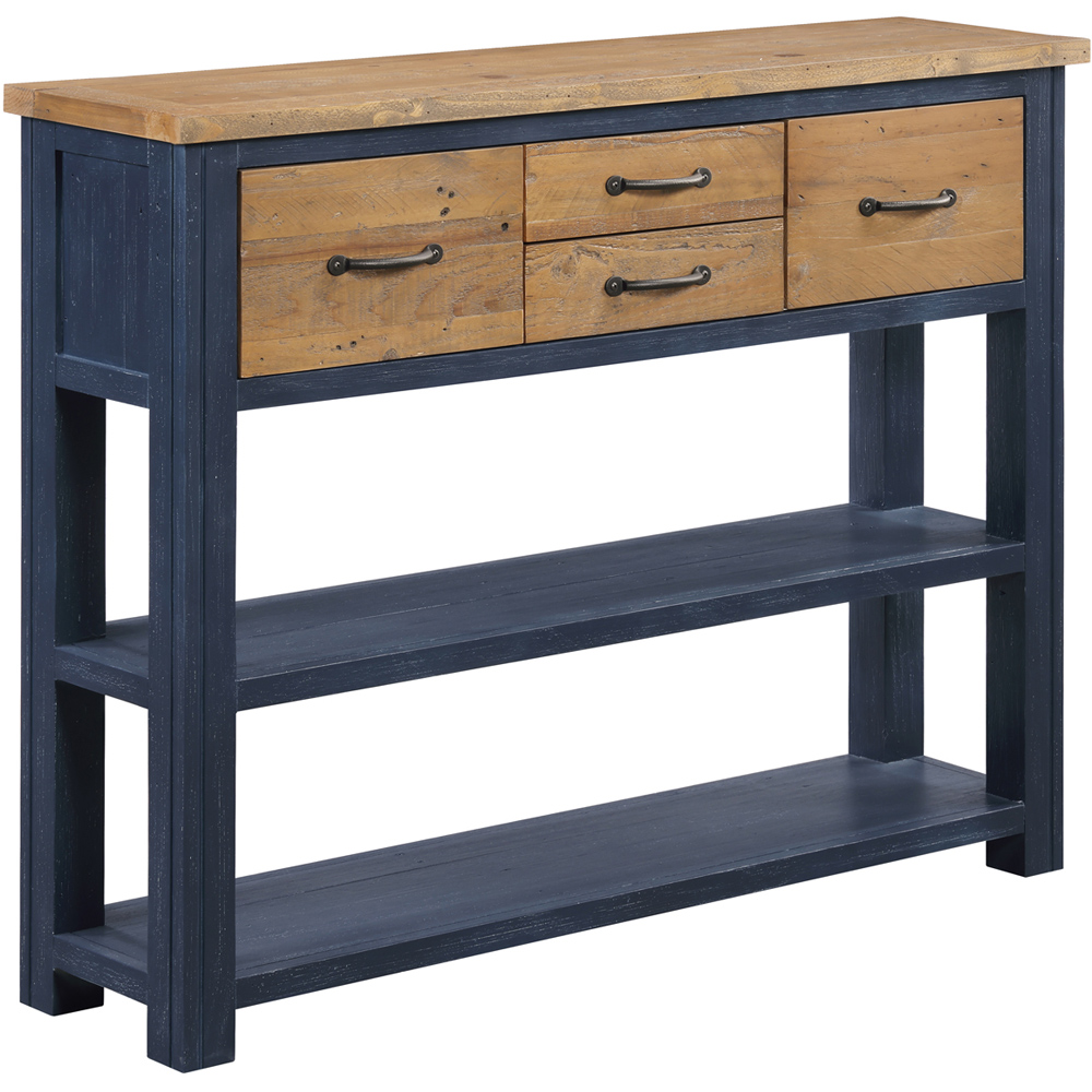 Elevate your space with this stylish Baumhaus Splash of Blue 4 Drawer 2 Shelf Wooden Blue Low Bookcase. It is versatile enough for both living rooms and hallways, it features two large and two small drawers at the top, along with two shelves at the base. Crafted with finesse and modernity, it showcases clean lines and an on-trend paint finish, all expertly handcrafted from reclaimed weathered wood with a striking colour scheme. Handcrafted by skilled artisans, the collection embraces the rustic allure of reclaimed wood. The painted sections undergo meticulous hand spraying to achieve a flawless, contrasting finish against the natural wood, resulting in a collection that's truly a masterpiece. To safeguard the beauty of the reclaimed timber, a clear, durable lacquer is applied, accentuating the distinctive wood grain of each piece. The addition of blue accents and steel handles adds character, elevating your home decor with timeless elegance. Crafted from environmentally friendly reclaimed wood with a natural finish and contrasting white accents. Arrives fully assembled and backed by a five-year manufacturer's guarantee. Overall dimensions: H90cm W120cm D30cm. Shelf dimensions: H30cm W108cm D28cm. Large drawer dimensions: H20cm W34cm D26cm. Small drawer dimensions: H10cm W34cm D26cm. Delivered fully assembled.
