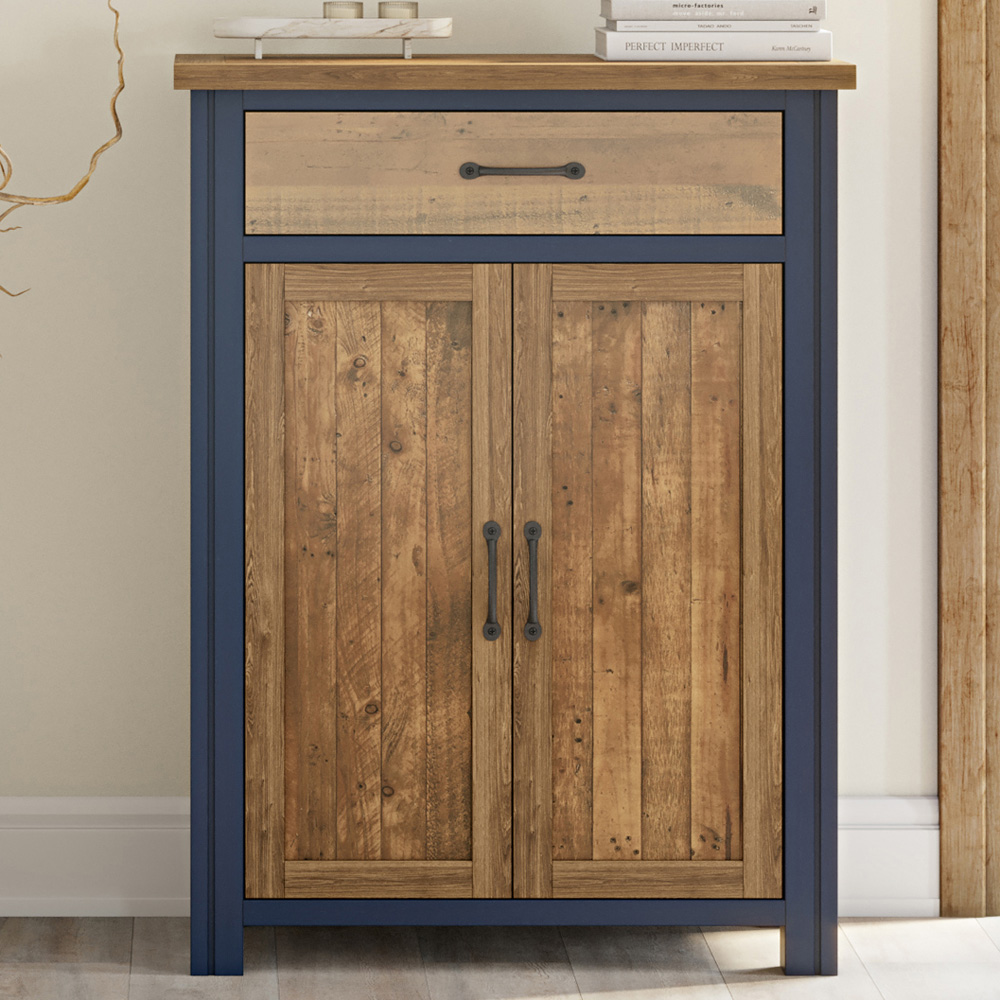 Keep your space neat and stylish with the Baumhaus Splash of Blue Single Drawer Double Door Shoe Storage Cabinet. This functional piece keeps shoes neatly stored behind its double doors, offering space for up to fourteen pairs. Additionally, a convenient drawer at the top, finished with a sleek steel handle, provides extra storage versatility. Crafted with care, it features clean lines and a contemporary paint finish, meticulously handcrafted from reclaimed weathered wood with a contrasting colourway. Each piece exudes a unique charm, showcasing the rustic allure of the reclaimed wood, including its grain markings, knots, and subtle colour variations. To maintain the beauty of the reclaimed timber, a durable clear lacquer is applied, enhancing its natural characteristics while providing protection. Delivered fully assembled. Backed by a comprehensive 5-year warranty, it guarantees quality and reliability. Overall dimensions: H110cm W82cm D39cm, drawer dimensions: H15cm W70cm D34cm.