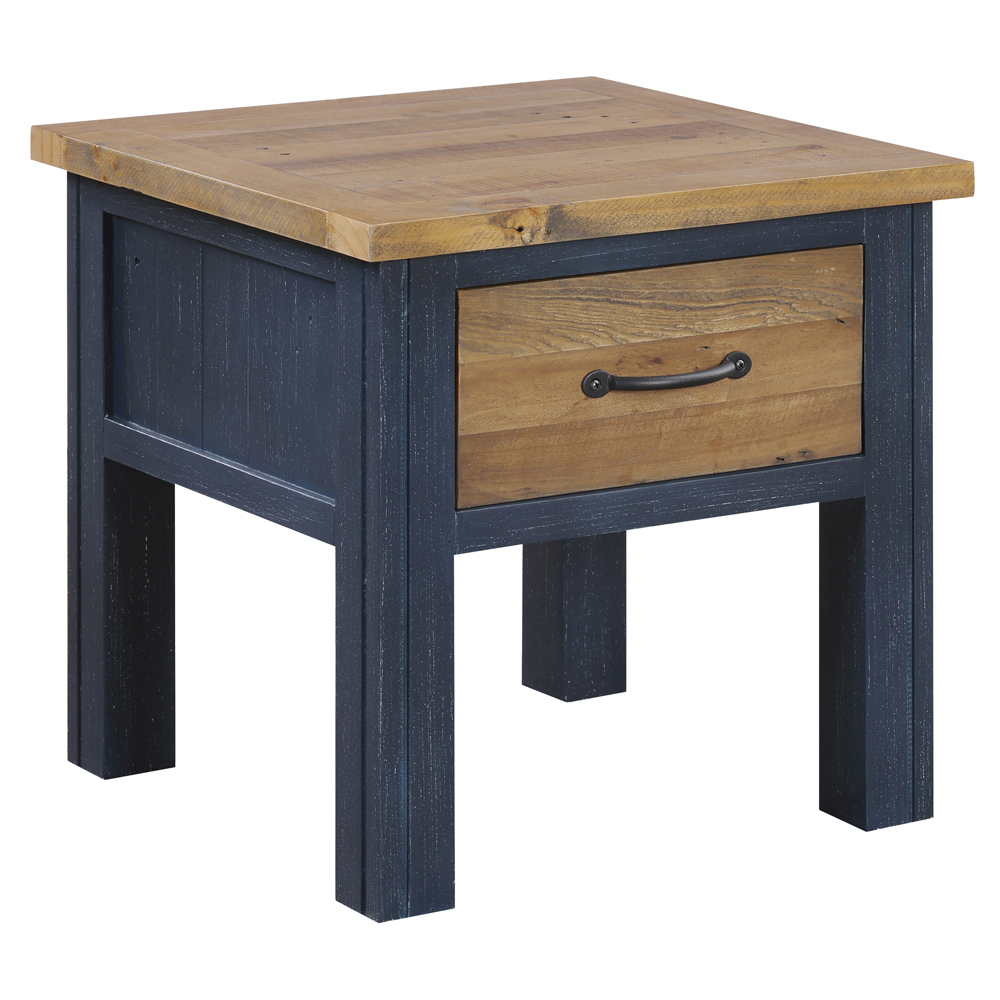 Enhance your space with the Baumhaus Splash of Blue Single Shelf Wooden Lamp Table. It is a versatile accent piece that adds style to any space, whether placed beside a sofa or used as a bedside table. Its practical shelf provides additional storage, while its clean lines and modern paint finish lend a touch of sophistication to any room. Crafted with care by skilled artisans, the beauty of reclaimed weathered wood, highlights its rustic charm, grain markings, and subtle colour variations. Each piece is meticulously handcrafted to ensure its uniqueness, with painted sections receiving multiple layers for a flawless, contrasting finish against the natural wood. To protect the reclaimed timber, a durable clear lacquer is applied, enhancing the wood grain. The Lamp Table is delivered fully assembled and is backed by a five-year manufacturer's guarantee, ensuring peace of mind and quality craftsmanship. Overall dimensions: H50cm W50cm D50cm. Delivered fully assembled. Backed by a comprehensive 5-year warranty, it guarantees quality and reliability.