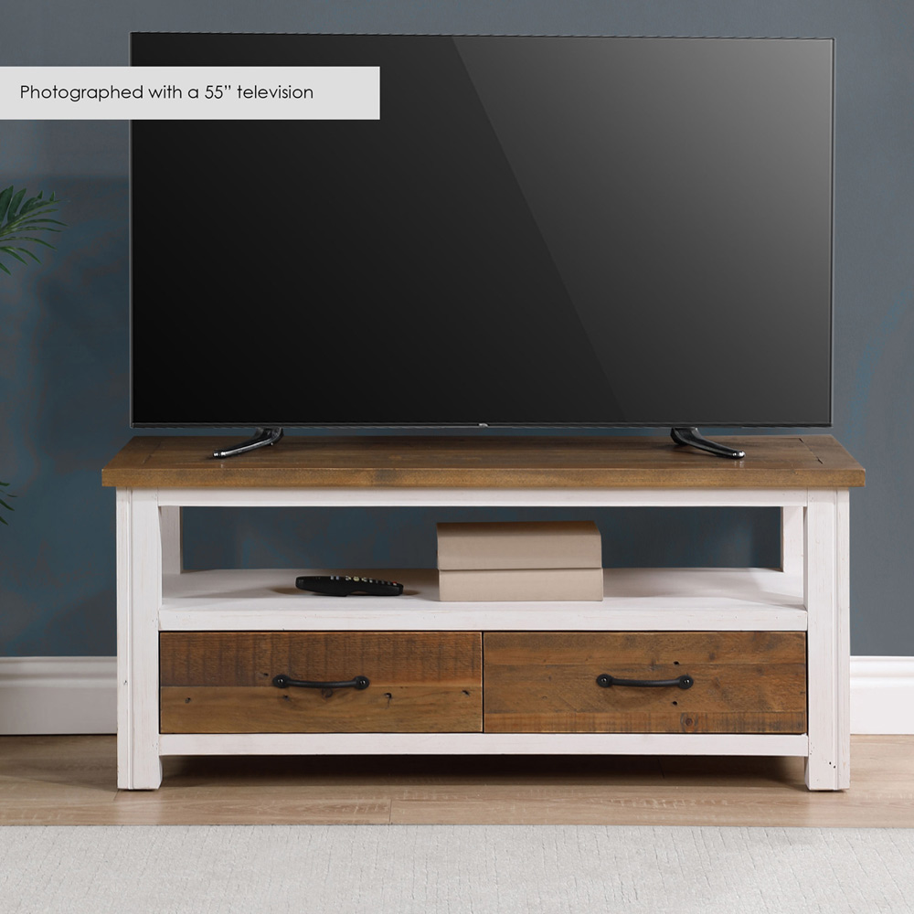 Enhance your living space with Baumhaus Splash of White Single Shelf 2 Drawer Widescreen White Television Cabinet. Crafted to accommodate a 50-inch TV, it features two drawers adorned with steel handles and an open shelf for added functionality. The clean lines and modern paint finish of the Splash of White range emanate from its meticulous handcrafting using reclaimed weathered wood, creating a striking contrast that enhances any space. The painted sections undergo careful hand spraying to achieve a flawless, contrasting finish against the wood's natural texture, resulting in truly unique works of art. To safeguard the allure of the reclaimed timber, a clear, durable lacquer is applied, accentuating the individual wood grain while preserving its inherent imperfections. The addition of a white colour scheme and steel handles infuses the furniture with character, elevating your home decor with enduring elegance. The widescreen TV cabinet arrives fully assembled and is backed by a five-year manufacturer's guarantee. Dimensions: H47cm W110cm D45cm. Drawer dimensions: H20cm W45cm D40cm.