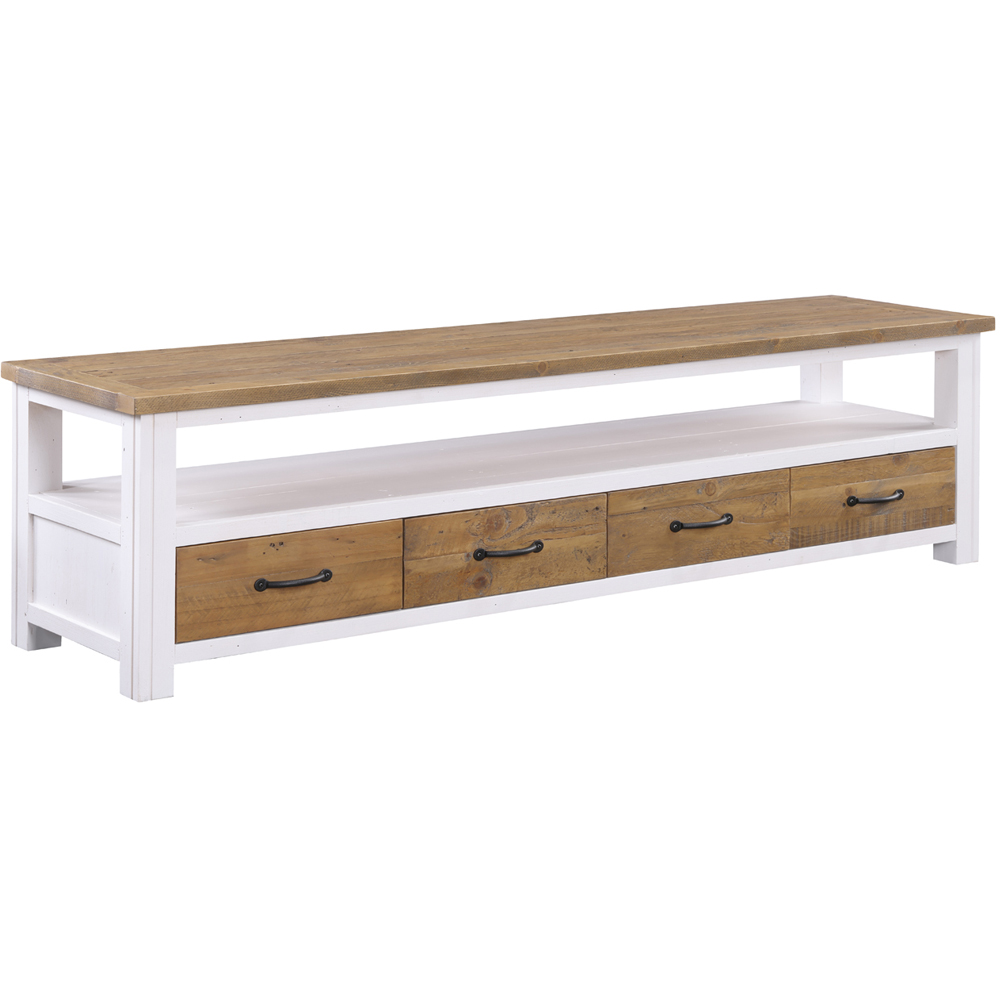 Elevate your home's decor with this stylish Baumhaus Splash of White 4 Drawer Large Widescreen TV Cabinet. It's handcrafted from reclaimed weathered wood and flaunts an on-trend white paint finish you'll love. This cabinet embraces the rustic charm of reclaimed wood and displays its natural grain, knots, and colour variations so you can enjoy a charming furniture piece. It's tailored for TVs up to 80 inches wide and features four drawers and a spacious open shelf for organising your media devices and consoles easily. The drawers sport steel handles that add a touch of character to them. This cabinet is finished with a clear hard-wearing lacquer that safeguards the beauty of the timber while accentuating the wood grain so you can enhance your home's decor effortlessly. Plus, it is delivered fully assembled and comes with a five-year manufacturer's guarantee so you can enjoy this piece for a long time. Overall size: H47 x W180 x D40cm. Drawer dimensions: H20 x W40 x D36cm.